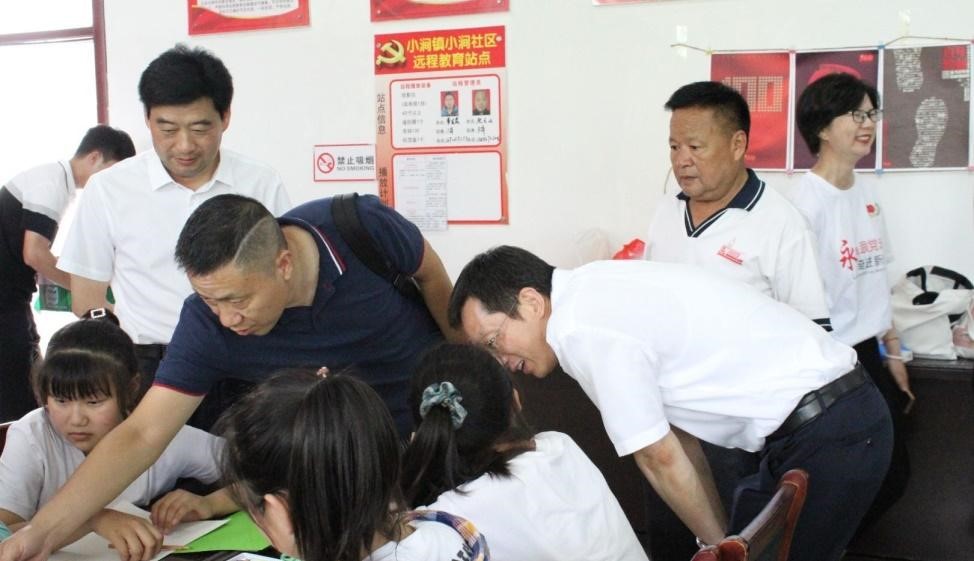 在蒙城县小涧镇学院艺术学生通过自己手绘的墙报在镇文化栏进行展出,并结合海报内容向小朋友们讲述党史故事。