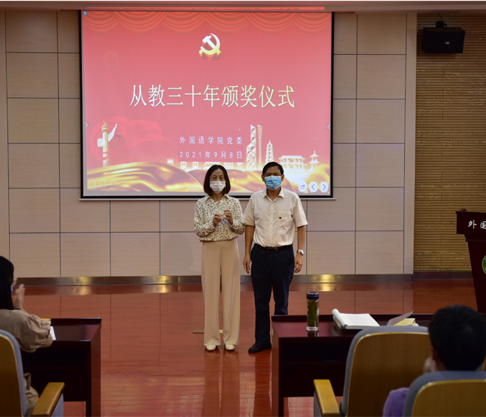 会上,院党委书记方章东为从教三十年的郭成芳老师颁发纪念杯。据悉,今年是外国语学院第五年在教师节来临之际为从教满30年及以上的老师颁发纪念品。方章东说:老教师对教育事业的热爱和奉献感染着每一位青年教师,鼓舞着他们继续为党育人守初心,为国育才担使命,争做时代“大先生”。