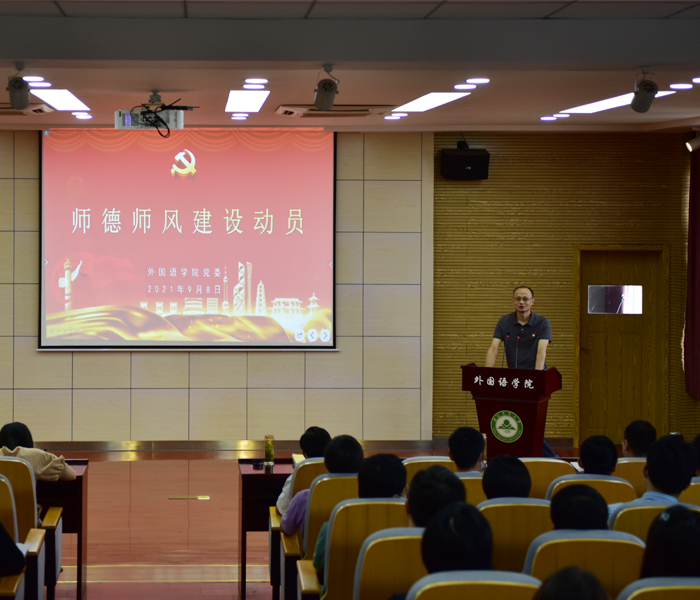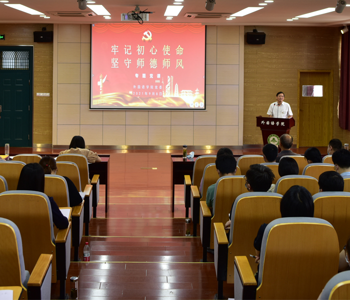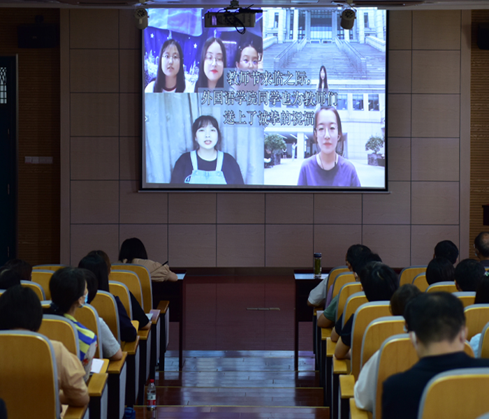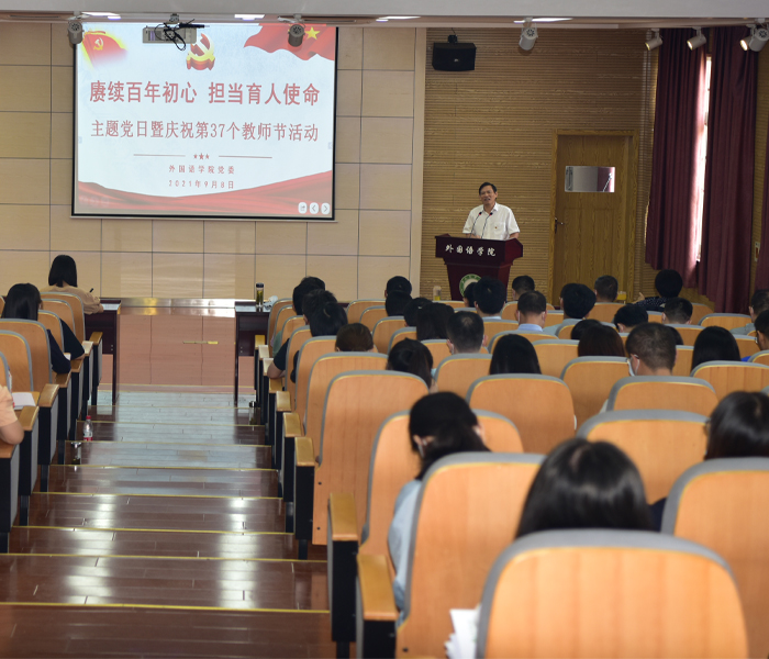 本网讯 金秋送爽,丹桂飘香。9月8日,外国语学院在外语楼502室开展“赓续百年初心,担当育人使命”主题党日暨第37个教师节庆祝大会。学院党政领导、全体教职工、学生党员参加活动,大会由院党委副书记姬惠惠主持。