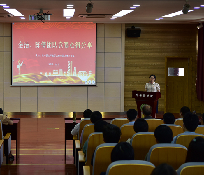 台下传来阵阵掌声,这是获得2021年全国高等学校外语微课优秀作品征集与交流活动安徽赛区一等奖的团队代表刘畅和获得2021年外研社杯教学大赛全国决赛三等奖的团队代表金洁在分享竞赛心得。