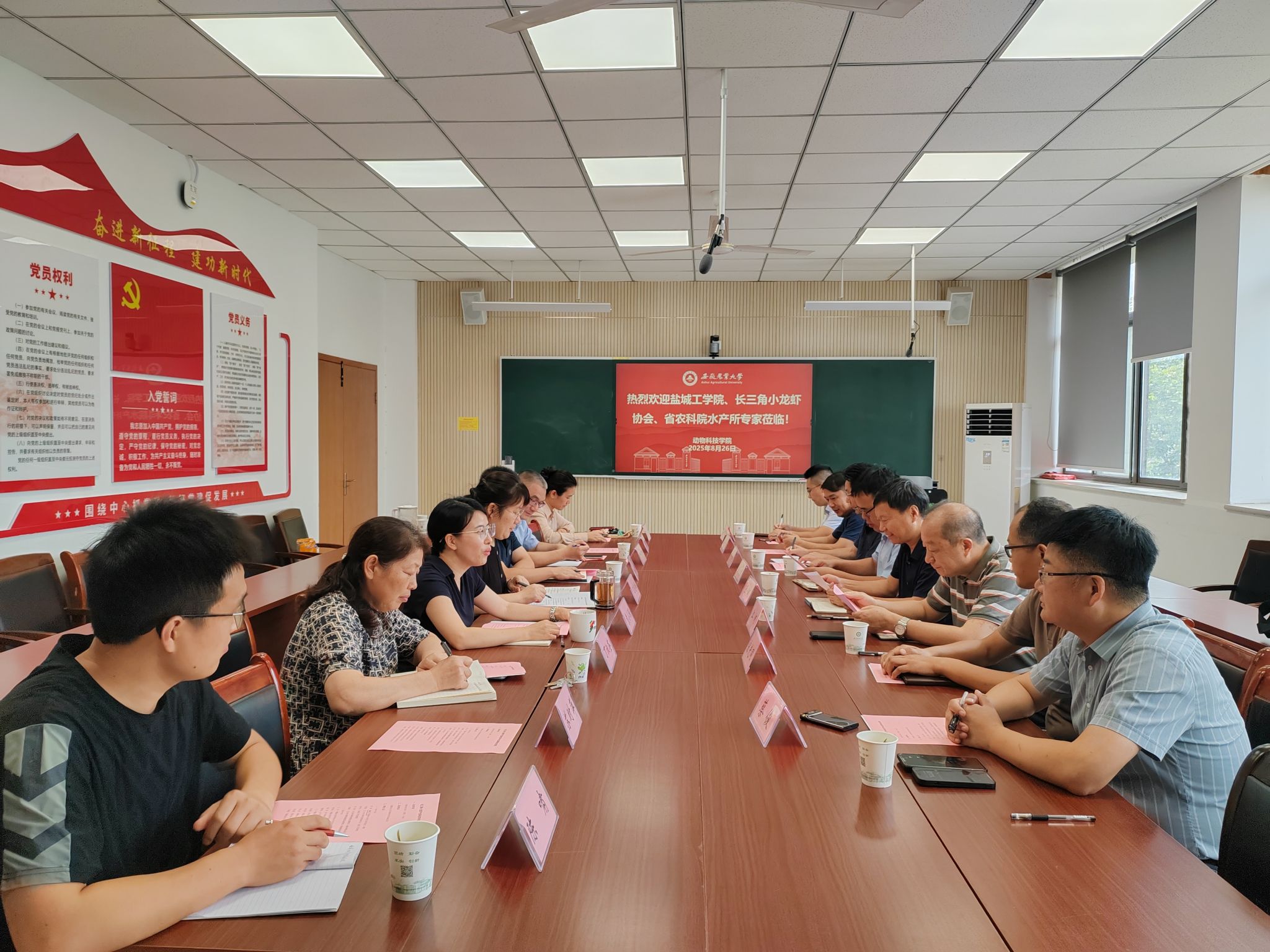本网讯 8月26日,盐城工学院海洋与生物工程学院、长三角小龙虾科技联盟、安徽省农业科学院水产研究所、水产养殖网等单位代表到访安徽农业大学动物科技学院,就第四届长三角小龙虾产业科技学术会议的筹备工作进行深入交流,学院党委书记沈兆梅、副院长袁小琛及水产系教师代表参加会议。