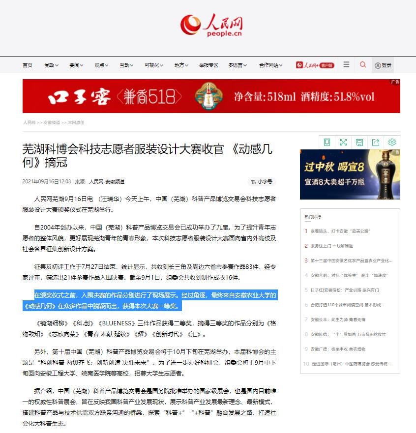 本网讯9月16日上午,中国(芜湖)科普产品博览交易会科技志愿者服装设计大赛颁奖仪式在芜湖举行。轻纺工程与艺术学院吴蓉老师指导的作品《动感几何》获得一等奖。本次大赛是国务院批准举办的国家级展会,也是国内目前唯一的权威性科普展会,旨在反映我国科普产业发展现状。