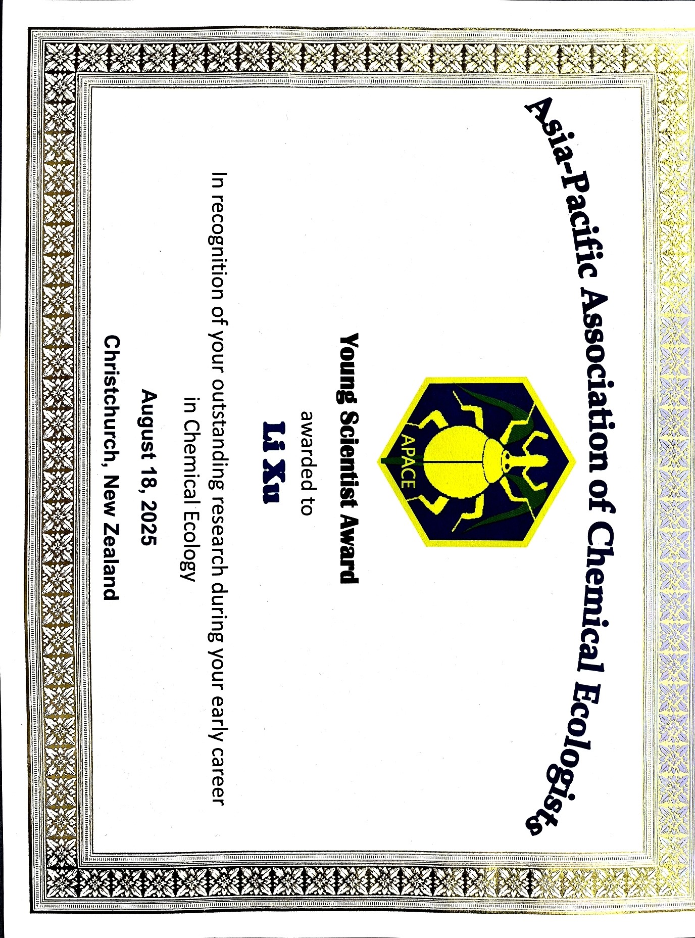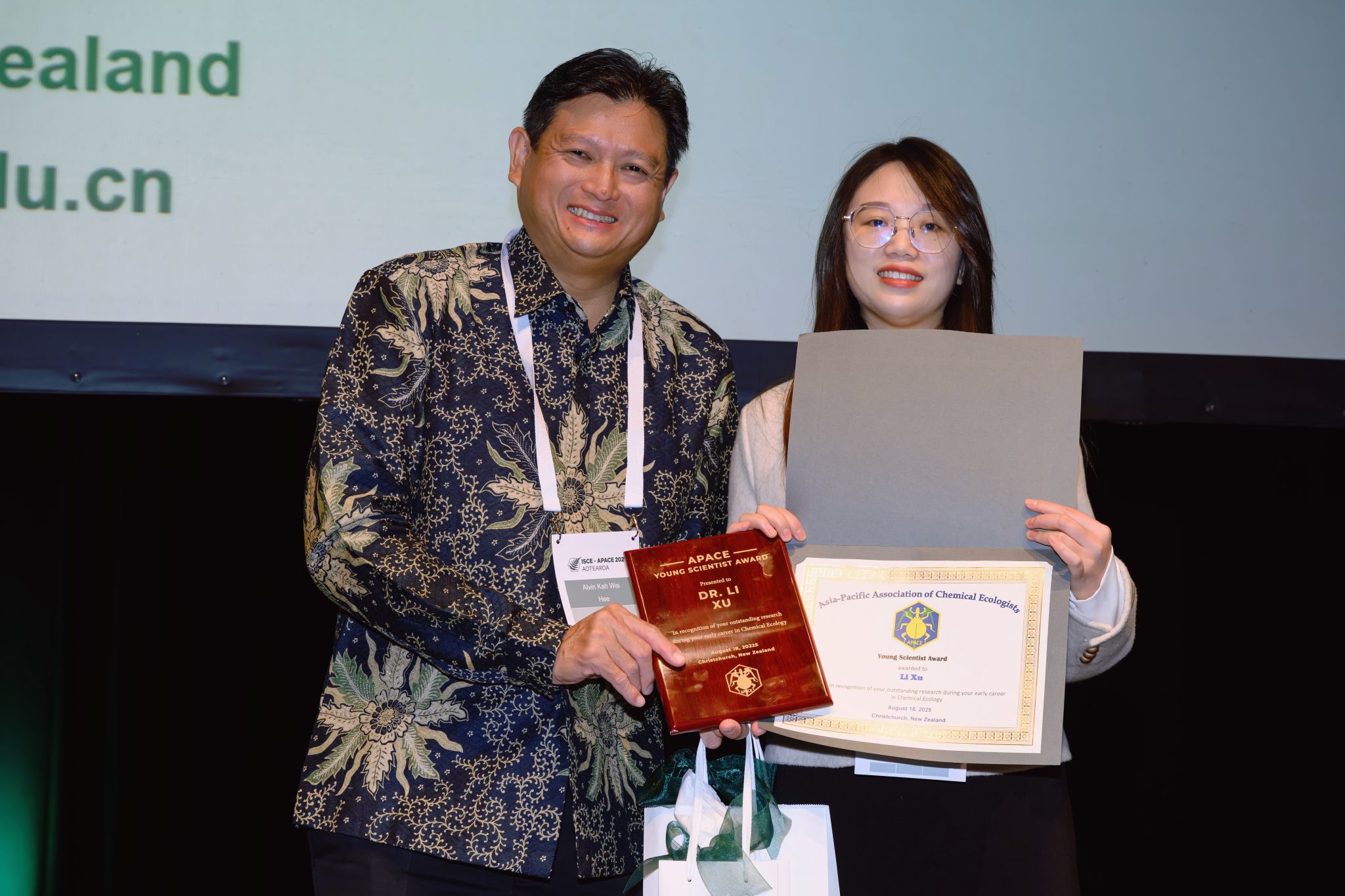 本网讯 近日,植物保护学院徐丽副教授荣获国际化学生态学会(ISCE)和亚太化学生态学会(APACE)2025年联合会议(ISCE-APACE 2025 Joint Conference of the International Society of Chemical Ecology and the Asia-Pacific Association of Chemical Ecologists)颁发的“青年科学家奖”(Young Scientist Award),以表彰其在化学生态学领域早期职业生涯中取得的突出学术成就。该联合会议每四年举办一届,汇聚全球化学生态学领域的科研人员与行业专家,共同探讨学科前沿议题。亚太化学生态学会青年科学家奖旨在嘉奖在化学生态学前沿研究中表现出卓越潜力的青年学者,该奖项每届在亚太地区授予一位青年科学家,以表彰其所做出的创新性贡献。