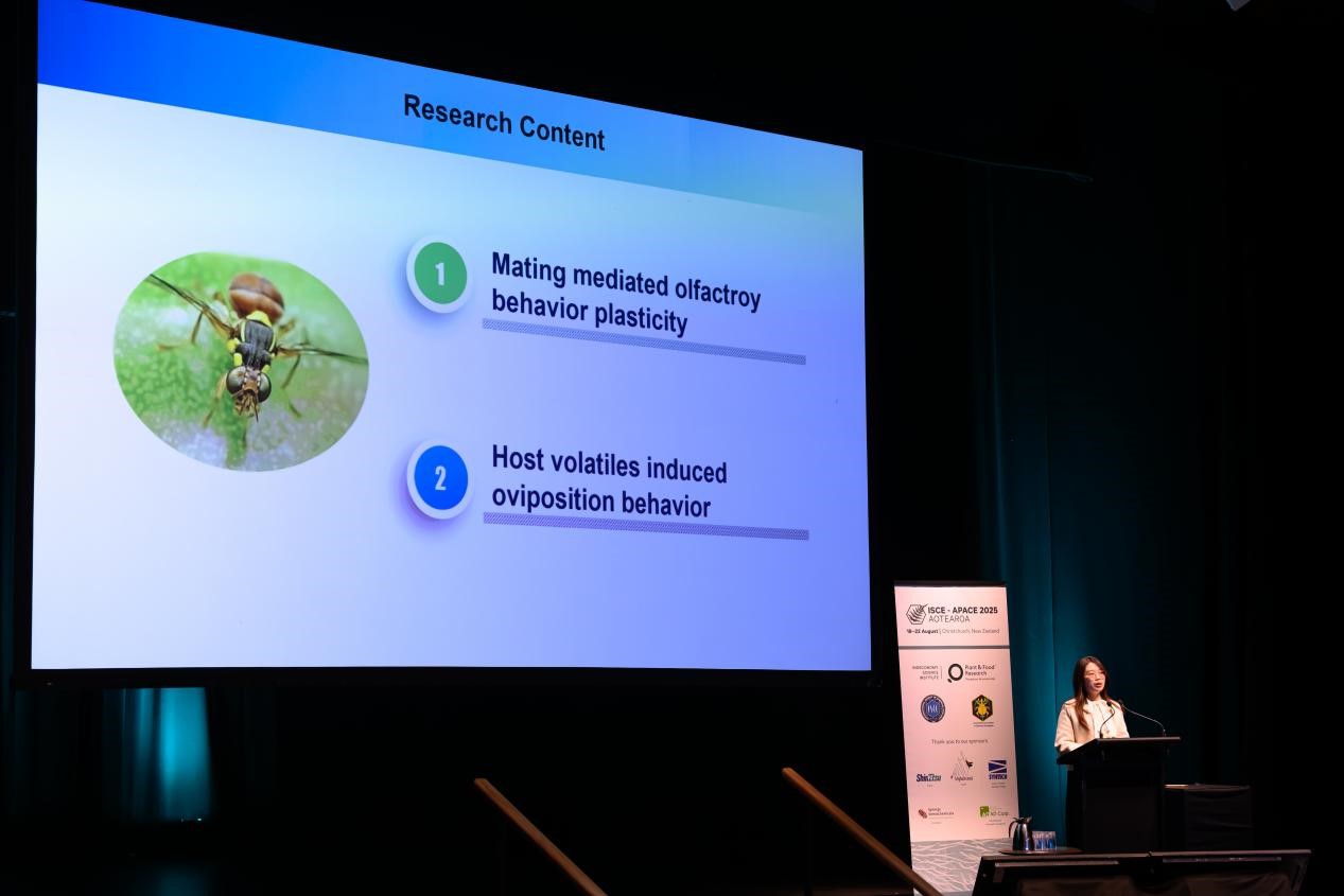 ISCE-APACE 2025联合会议于8月18日至22日在新西兰基督城举办,徐丽受邀参加并作题为“Molecular mechanisms of mating-mediated olfactory behavioral plasticity in the oriental fruit fly”的大会主旨报告。报告中,系统阐释了交配介导的橘小实蝇嗅觉行为可塑性的分子机制,并以苯并噻唑和1-辛烯-3-醇为例,深入解析了寄主挥发物诱导橘小实蝇产卵行为的分子基础。