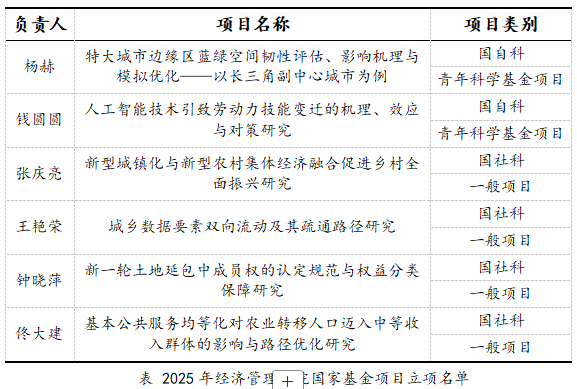 本网讯 近日,国家自然科学基金委员会和全国哲学社会科学工作办公室陆续公布2025年度国家自然科学基金与国家社会科学基金项目评审结果。安徽农业大学经济管理学院6项国家课题获批立项,其中钱圆圆副教授和杨赫副教授荣获国家自然科学基金青年项目立项,张庆亮教授、王艳荣教授、钟晓萍教授和佟大建副教授荣获国家社会科学基金一般项目立项。