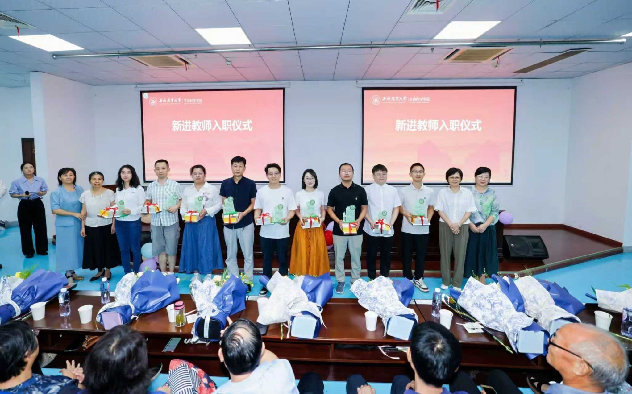 大会上,青年教师代表手持鲜花,以鞠躬礼向退休教师致以诚挚敬意。会上举行了新教师入职仪式,四位老教师代表上台,为新入职教师颁发教具和姓名牌,传承“师之范、德之馨”的教育精神。