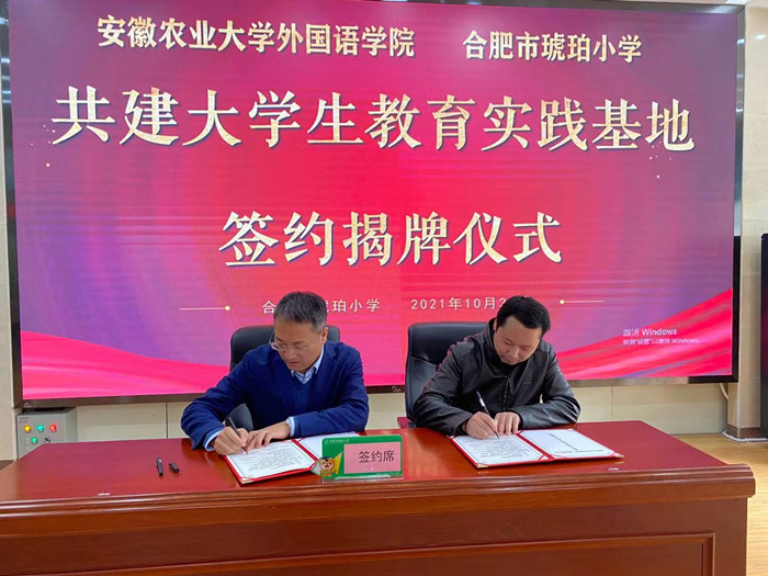 本网讯 10月22日,外国语学院与合肥市琥珀小学共建大学生教育实践基地揭牌仪式在琥珀小学东区阶梯教室举行。校教务处副处长李玮和琥珀小学书记彭玉柱为教育实践基地揭牌。外国语学院副院长许宗瑞、日语系主任王磊、法语系主任倪复生、院办公室老师殷霞、琥珀小学校长徐诗友、副校长杨维、主任戴超等参加。揭牌仪式由琥小老师钱坤主持。