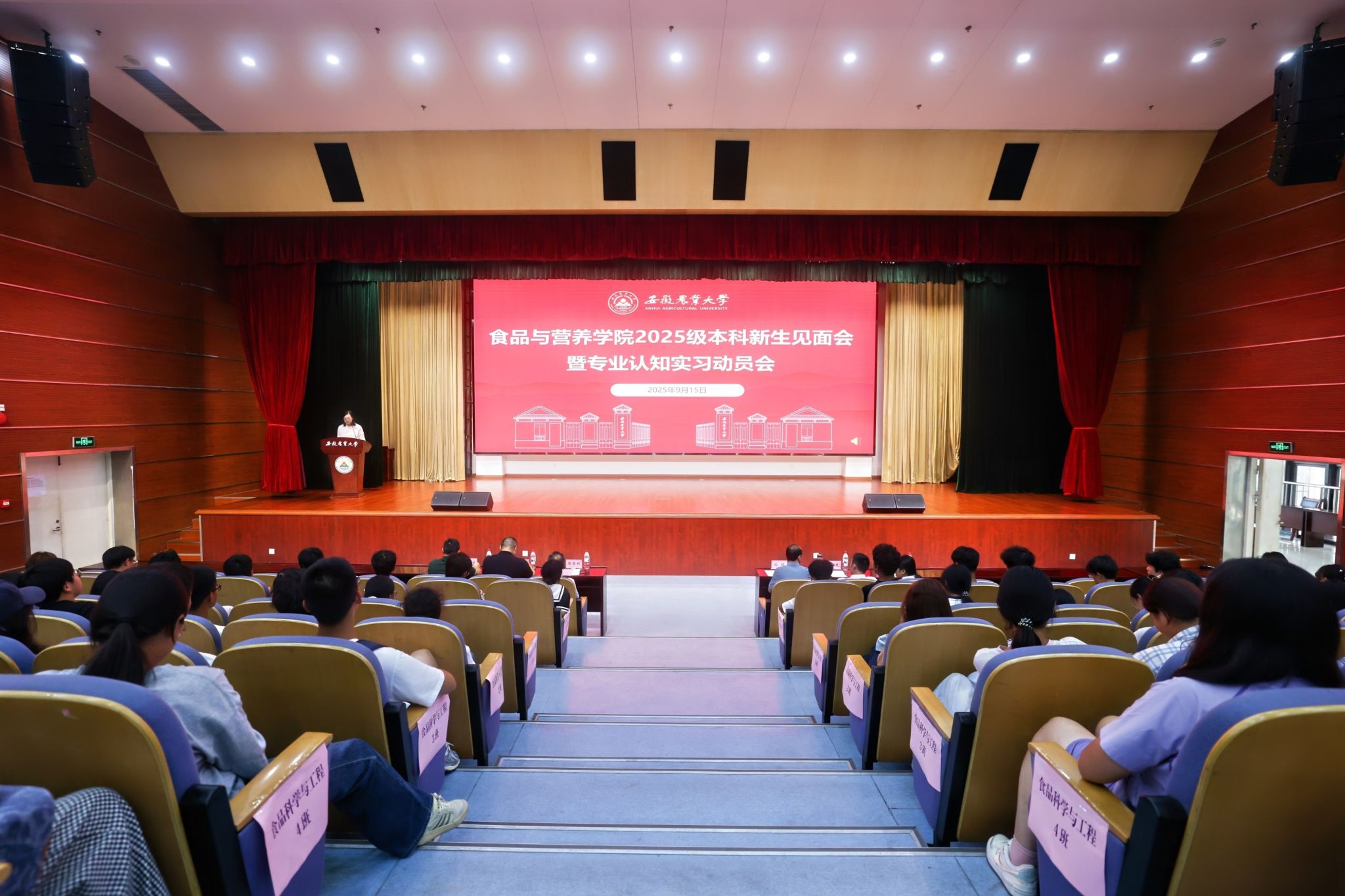 本网讯 9月16日下午,食品与营养学院2025级本科新生见面会暨认知实习动员会在图书馆第一报告厅举行。学院党政领导、系部主任、2025级本科新生辅导员及全体2025级本科新生齐聚一堂,会议由院党委副书记、纪委书记夏晓昀主持。