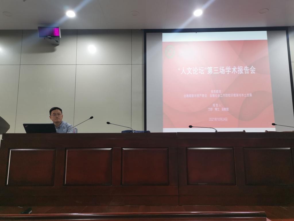 本网讯 10月24日下午,人文社会科学学院2021年“人文论坛”第三场讲座在图书馆第二报告厅开讲。本次讲座邀请我校2003级校友、中央财经大学副教授方舒作了题为《金融赋能与资产建设:金融社会工作的知识框架与本土发展》的报告。院长姜红在讲座后会见了方舒。讲座由社会学系李磊副教授主持。