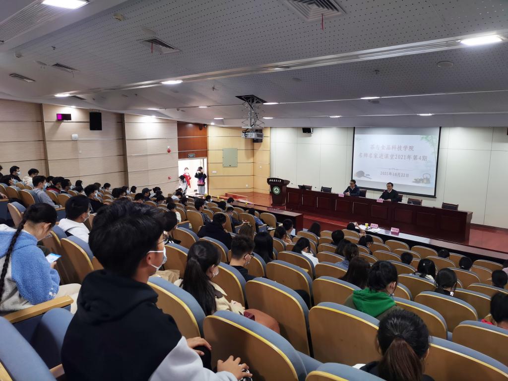 本网讯10月22日下午,茶与食品科技学院在图书馆第二报告厅举办名师名家进课堂活动,黄山水工茶业有限公司董事长兼创始人、我校2003届茶学校友江正南应邀授课,为同学们带来《青春正当时》的精彩报告。学院100余名同学到场聆听了报告,报告会由院长李大祥主持。