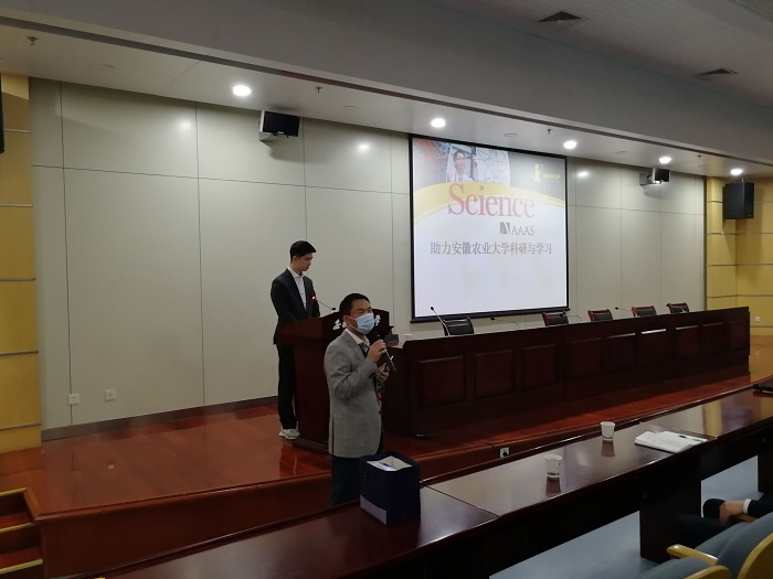 本网讯为了帮助师生更好的了解和使用Science数据库,10月26日下午,图书馆联合科技处在图书馆2号报告厅共同举办了题为“Science助力安徽农业大学科研与学习”的培训讲座。讲座邀请了iGroup China集团医学产品部资深培训师熊海舟主讲。讲座由图书馆副馆长吴永辉主持,来自全校各院系的120余名师生参与了这次培训讲座。
