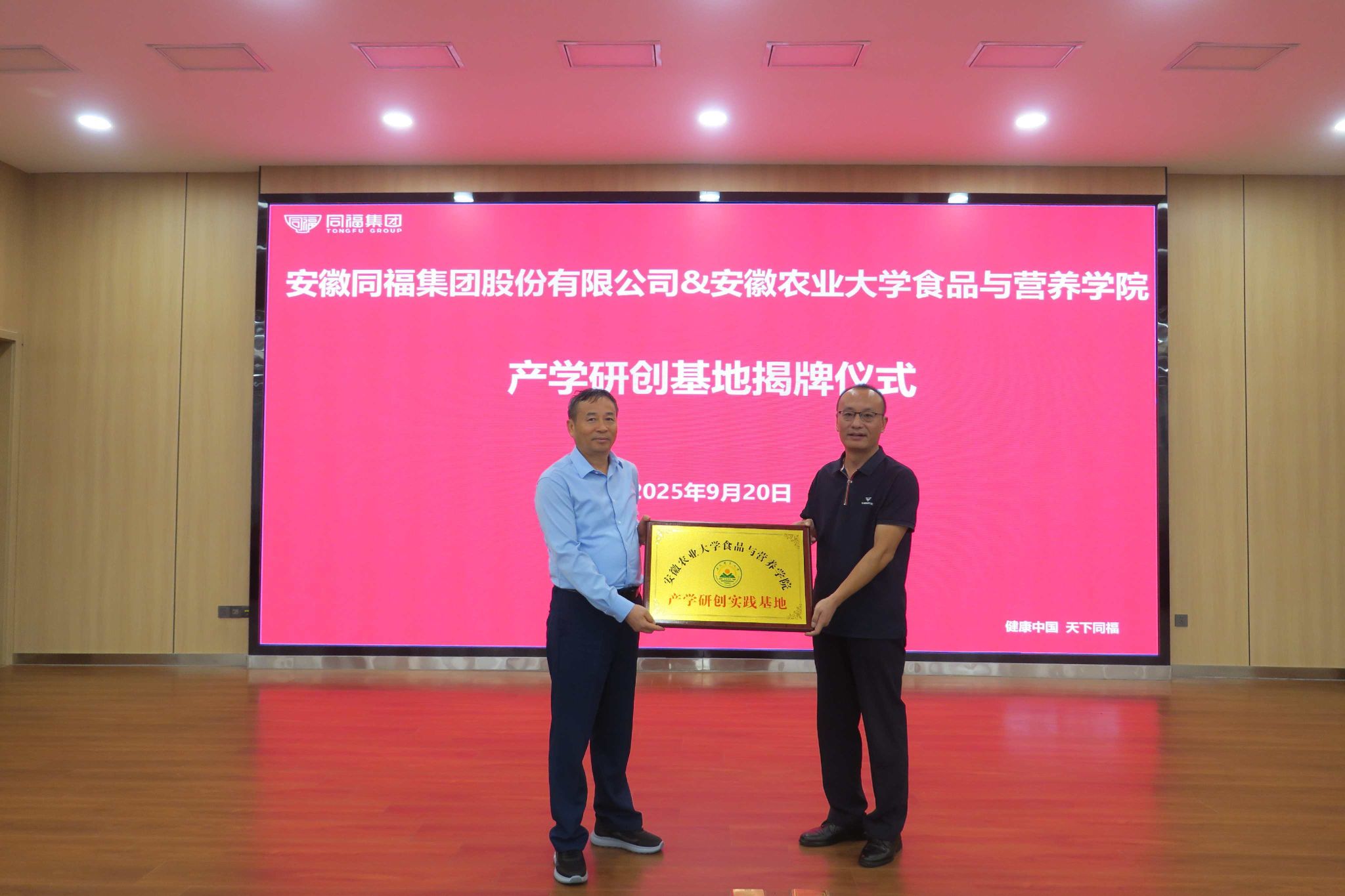 参观结束后,双方举行“产学研创实践基地”揭牌仪式。院长周裔彬与同福集团副总裁、安徽公司总经理王红武共同为实践基地揭牌。该基地的建立,标志着双方在人才培养、科研合作、技术开发与成果转化等方面的合作迈入新阶段。