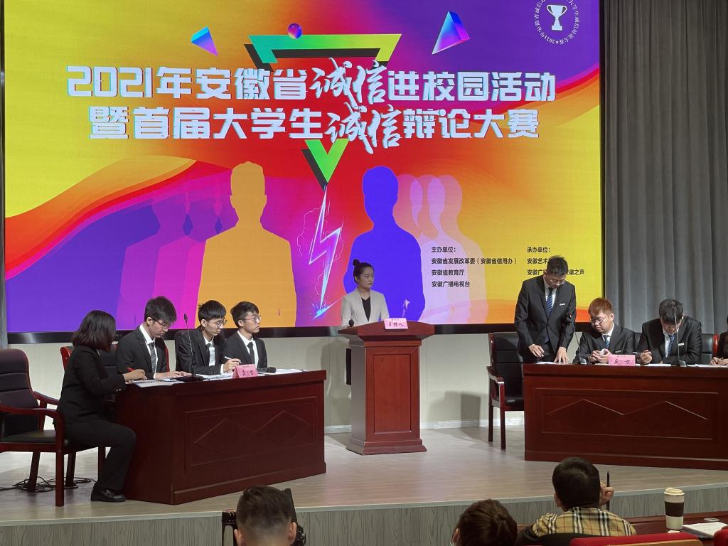 本网讯 10月27日上午,2021年安徽省诚信进校园活动暨首届大学生诚信辩论赛合肥赛区决赛在安徽艺术学院举行。经前期全校选拔,我校人文社会科学学院代表学校参加合肥赛区赛。此次合肥赛区赛,共有安徽大学、安徽建筑大学等12只参赛队参加复赛,我校代表队历经三轮淘汰赛的角逐,取得了合肥赛区第一名的优秀成绩,并将代表合肥赛区参加全省决赛阶段的比赛。