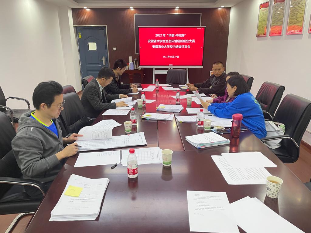 本网讯 10月29日下午, 2021年“华骐·中旭杯”安徽省大学生生态环境创新创业大赛安徽农业大学选拔赛评审会在中西部综合楼南楼506会议室举行,校内外生态环境学科专家、创新创业指导专家共同对全校参赛作品开展评审。