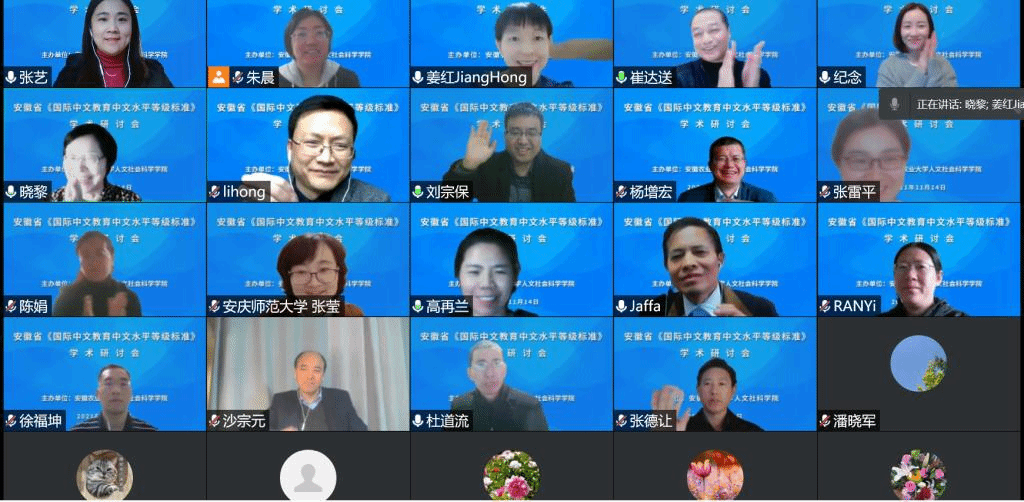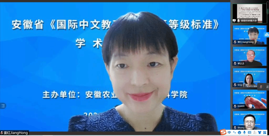 本网讯 11月14日下午,安徽省《国际中文教育中文水平等级标准》学术研讨会在云端开幕。本次研讨会由人文社会科学学院主办,以“国际中文教育中文水平等级标准”为主题。人文社会科学学院院长、安徽省汉语国际教育研究会常务副会长姜红教授主持会议。