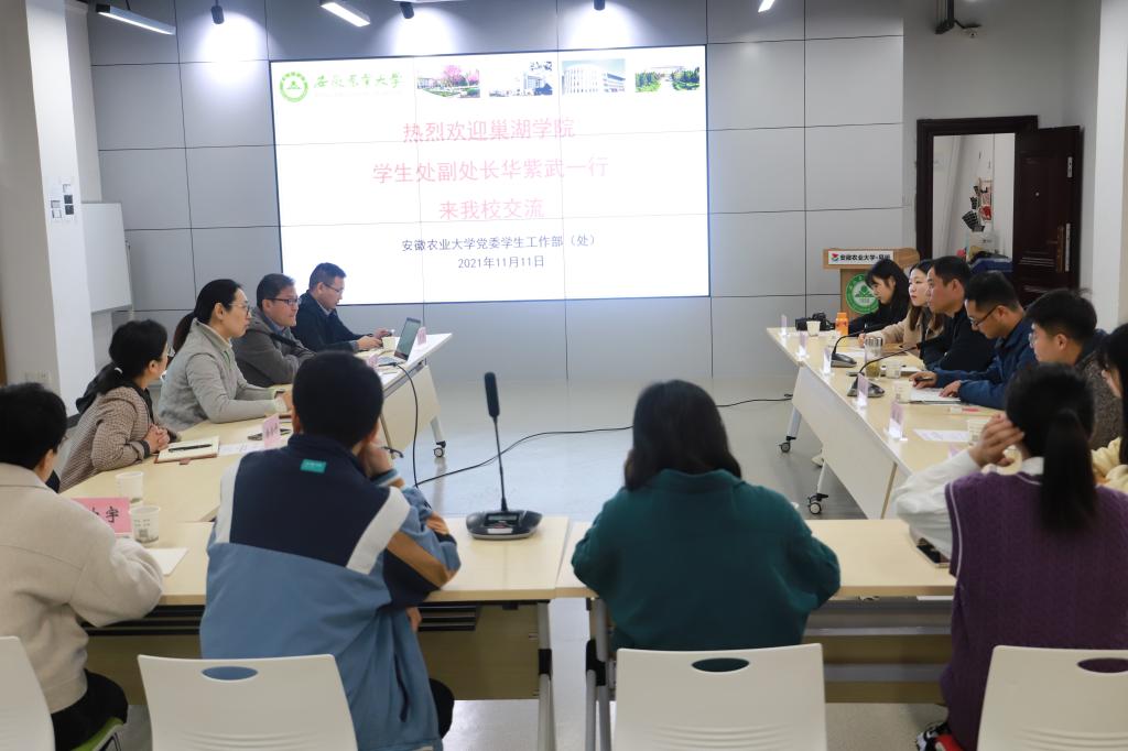 本网讯 11月11日,巢湖学院学生处副处长华紫武一行6人来我校学工部(处)调研网络思政、易班运营和学生团队管理等工作。校党委副书记裴树东、学工部(处)处长姚莉在交流会前与华紫武一行进行了简单的交谈。学工部(处)相关老师和易班工作站学生干部代表参加交流会。学生处副处长刘柳主持交流会。