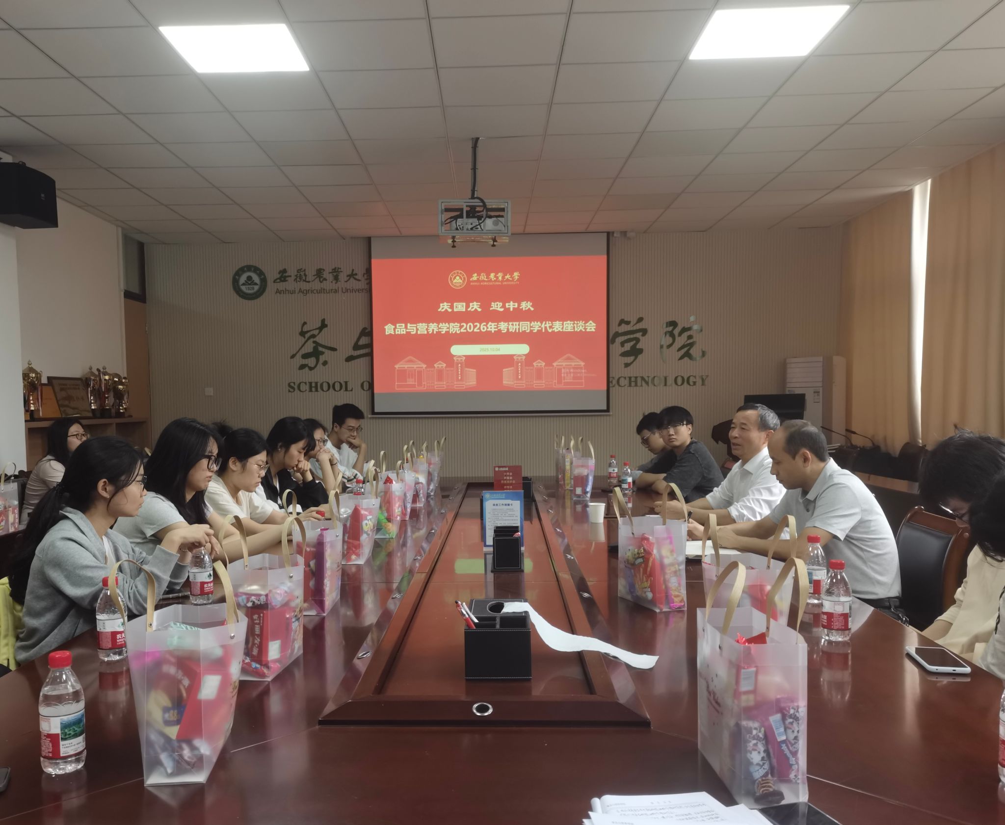 本网讯 国庆、中秋双节相逢之际,为助力2026届考研学子坚定目标、缓解压力、科学备考,10月4日上午,食品与营养学院组织召开“情暖双节,助力考研”2026届考研学生代表座谈会。学院党委书记孙福、院长周裔彬与备考学生代表齐聚一堂,现场气氛温馨,交流互动热烈。