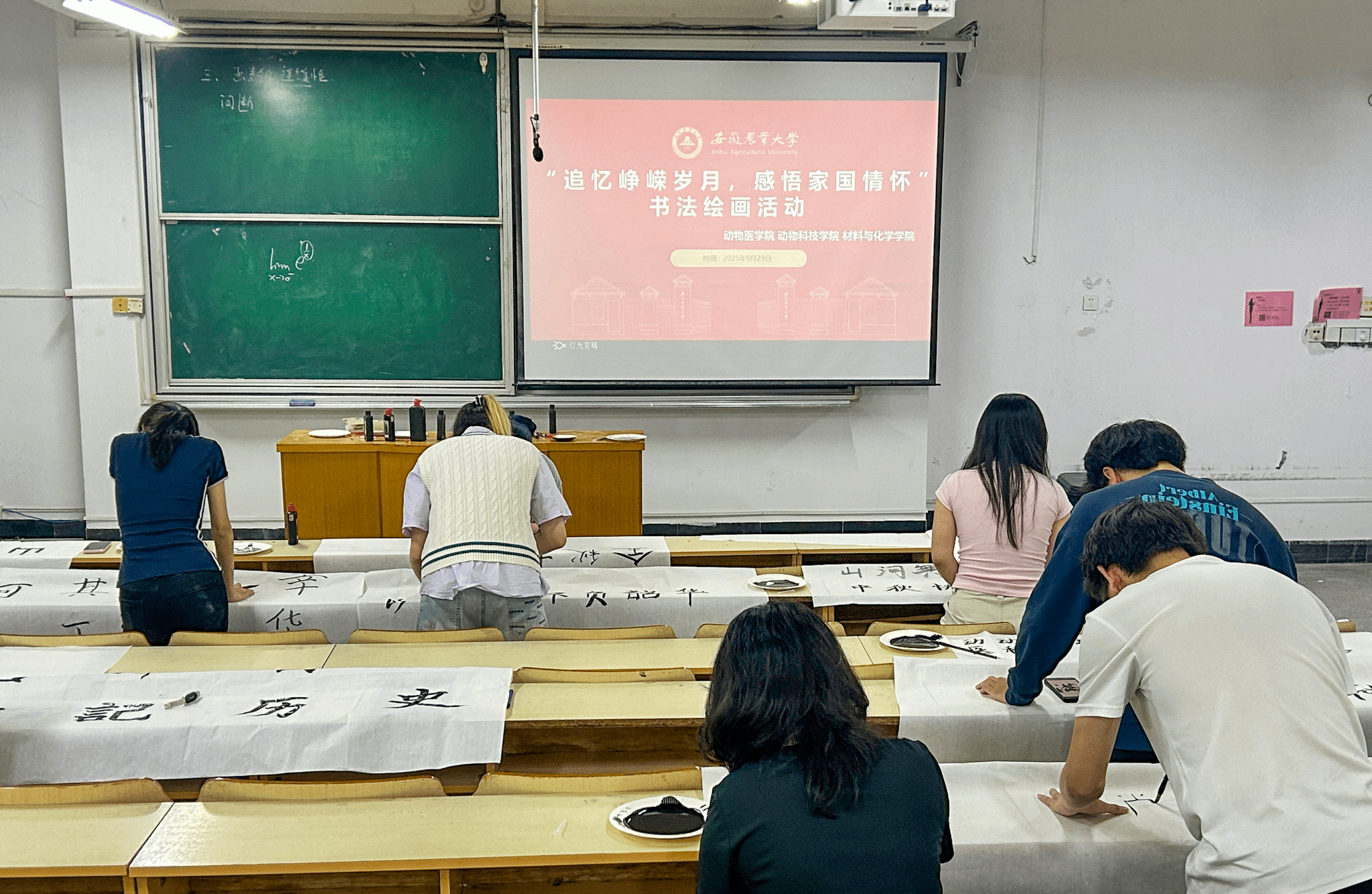 9月29日晚,动物医学院联合动物科技学院、材料与化学学院共同举办的“追忆峥嵘岁月,感悟家国情怀”主题书画活动,在勤学楼203教室温情上演,活动现场墨香萦绕,色彩纷呈。在书法区,同学们挥毫泼墨,将革命先烈的铮铮誓言与对祖国的深情祝福凝于笔端;在绘画区,同学们巧妙构思,用画笔描绘祖国壮丽山河与盛世景象。一动一静之间,艺术与情怀交融,学子们在一笔一划的勾勒与一抹一染的着色中,沉浸式感悟着家国情怀的深厚底蕴与时代使命的召唤。