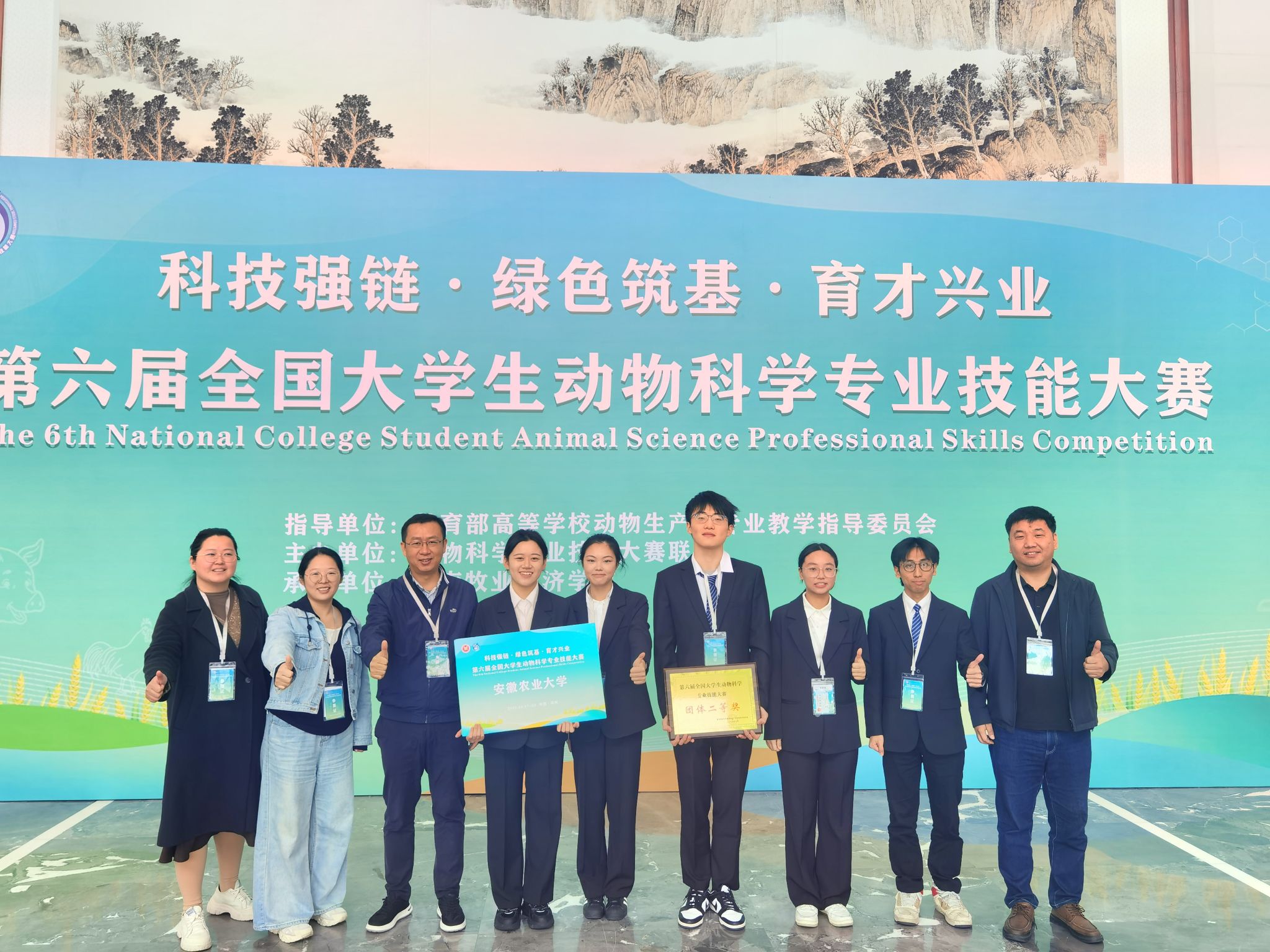 本网讯 10月17日至19日,由教育部高等学校动物生产类专业教学指导委员会指导、国家动物科学专业技能大赛联盟主办的第六届全国大学生动物科学专业技能大赛在河南牧业经济学院举办。本次大赛汇聚了全国73所顶尖高等农林院校的近400名优秀的动科学子。动物科技学院由曹祖兵副院长和卢伟副书记担任领队,繁育系和营养系相关老师担任指导老师,2023级动物科学专业李康民、杨百川、尚嘉怡、张若怡、侯灿灿五位同学组成的参赛队伍参加比赛。经过激烈角逐,最终获得团体二等奖的优异成绩。