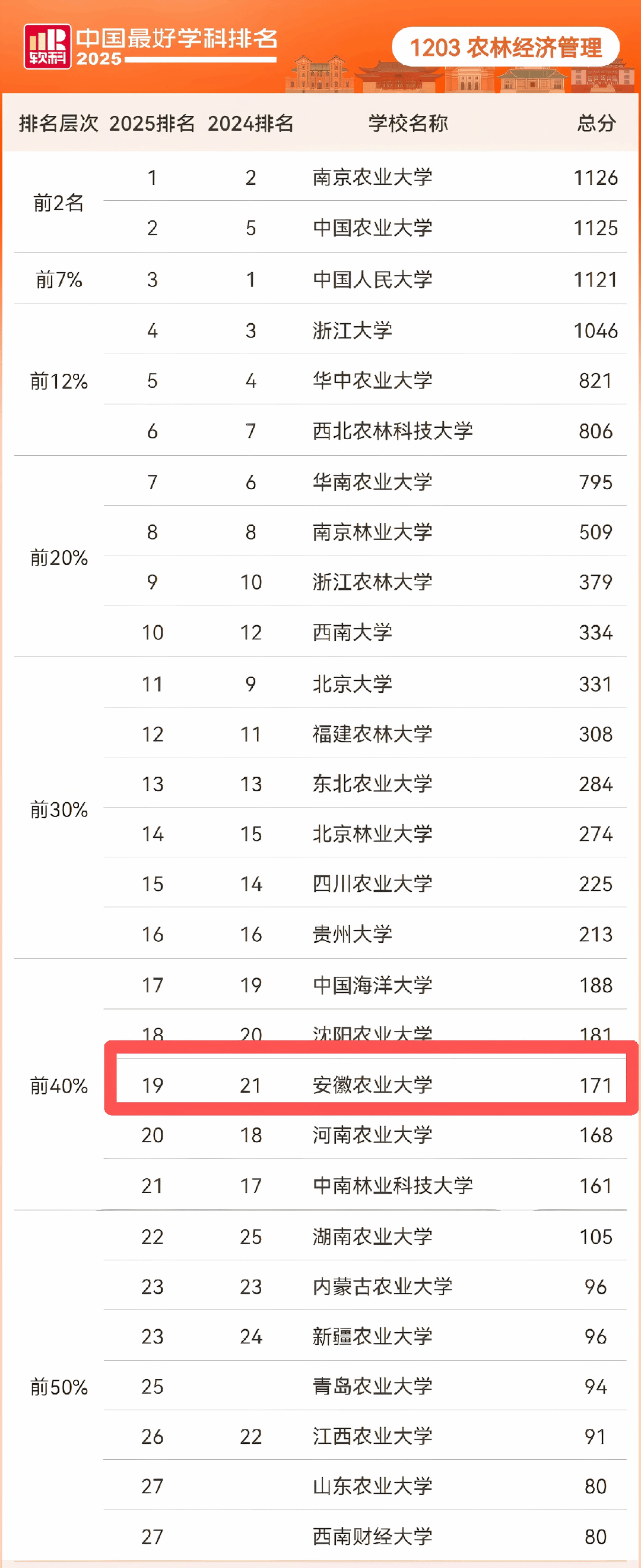 本网讯 近日,国际知名高等教育评价机构软科发布2025“中国最好学科排名”,我校农林经济管理学科再次上榜,排名实现新突破,从去年首次进入前50%,跃进至今年前40%。
