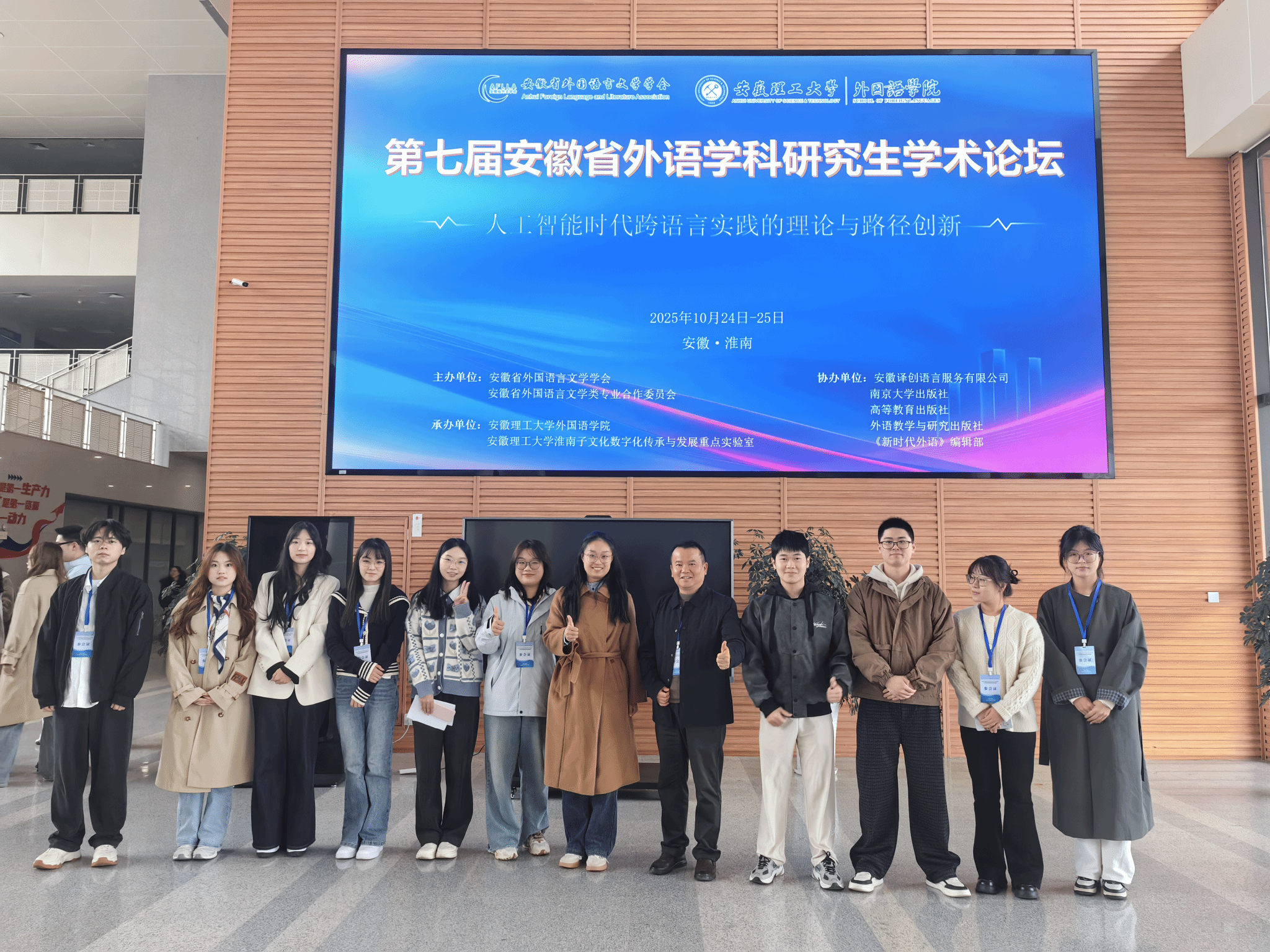 本网讯 10月25日,第七届安徽省外语学科研究生学术论坛在淮南成功举办。该论坛由安徽省外国语言文学学会、安徽省外国语言文学类专业合作委员会联合主办,安徽理工大学外国语学院与安徽理工大学淮南子文化数字化传承与发展重点实验室共同承办。我校外国语学院翻译硕士学位点负责人、英语系主任刘成科及研究生代表参加了此次论坛。