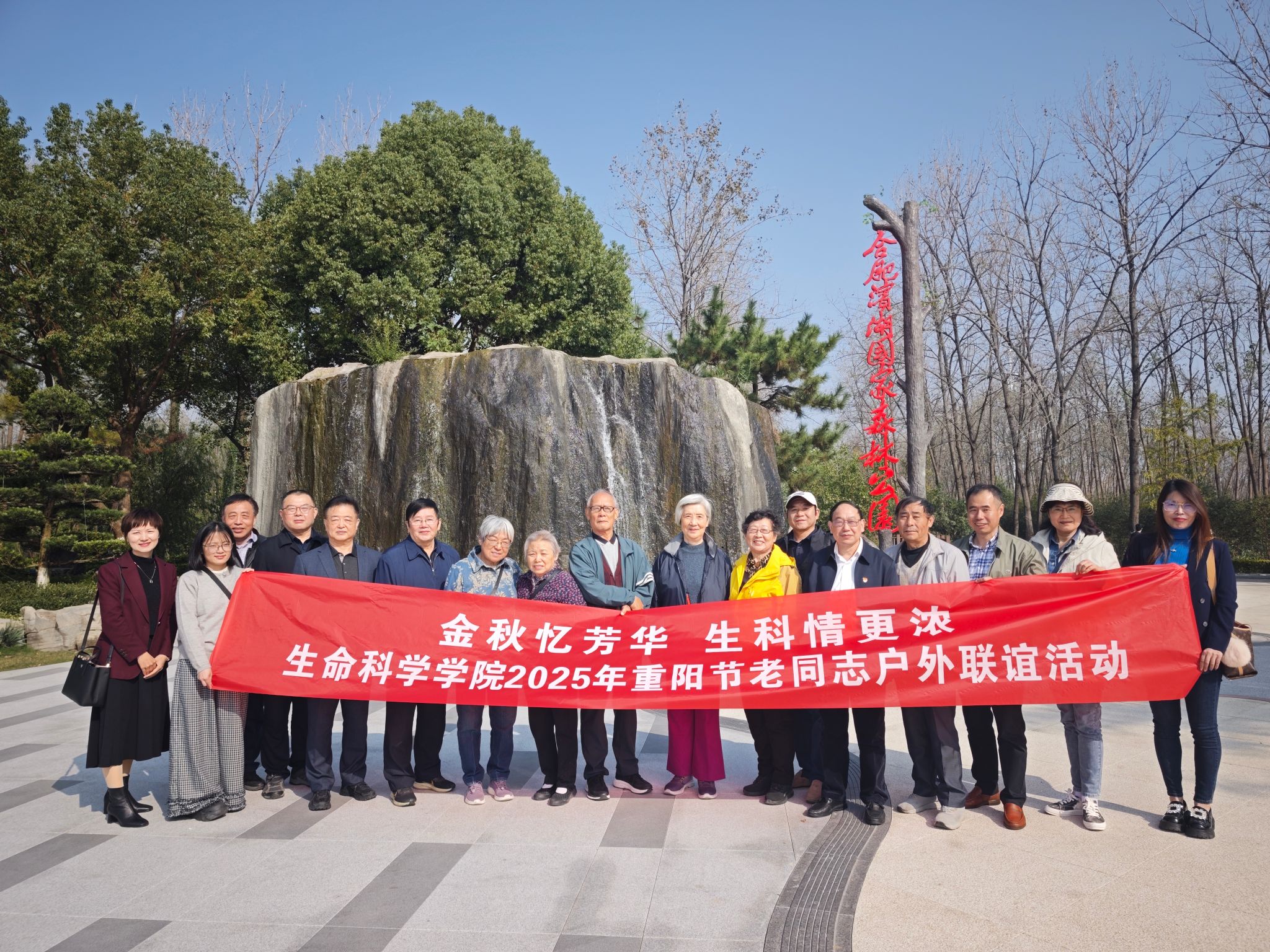本网讯 10月28日,在重阳节来临之际,生命科学学院组织了“金秋忆芳华 生科情更浓”重阳节老同志户外联谊活动。学院党委副书记(主持工作)夏利明、副院长何兵与学院部分离退休老同志共同参加了此次活动。