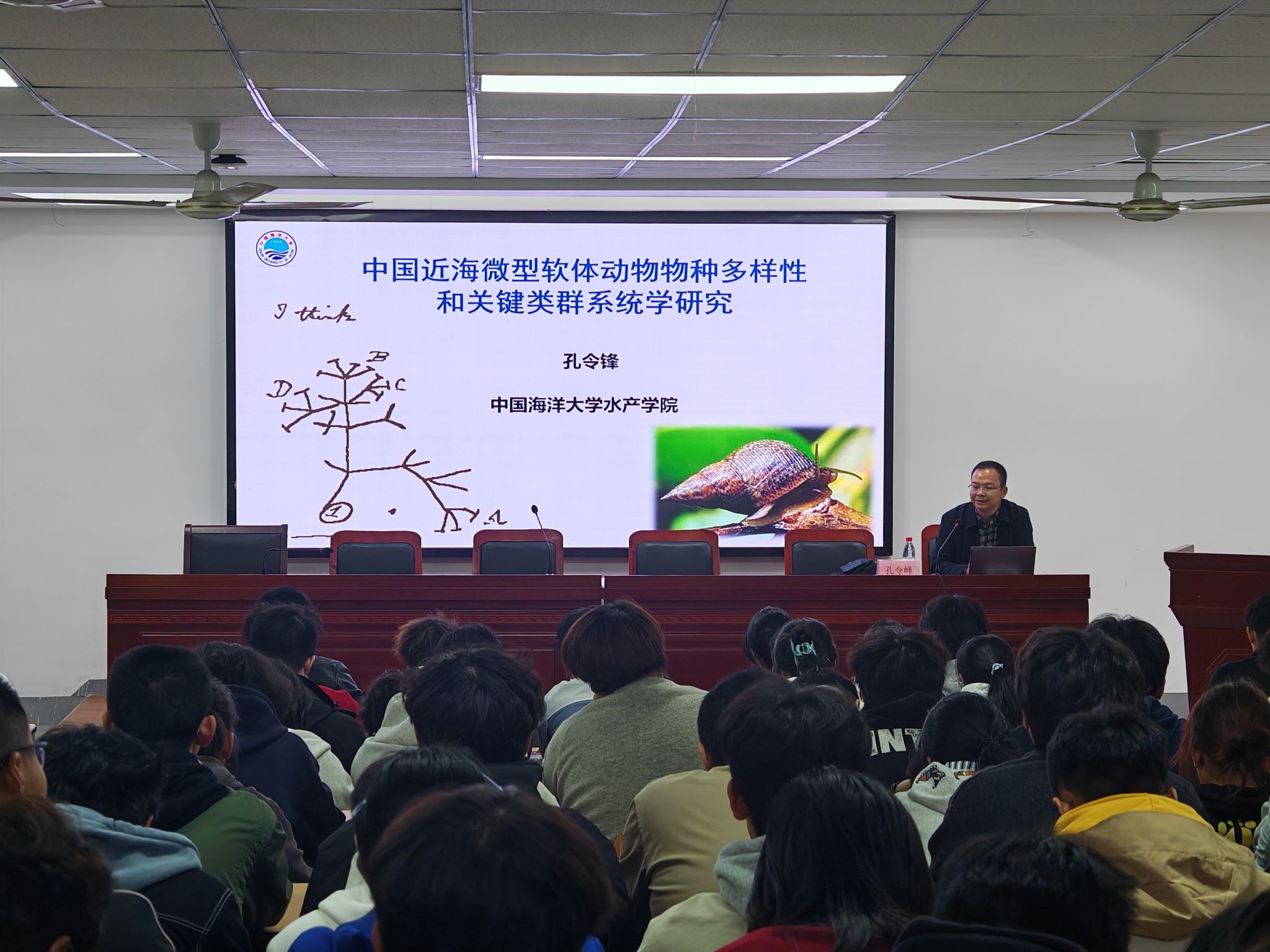 报告中,孔令锋聚焦“中国近海微型软体动物物种多样性和关键类群系统学研究”,从研究背景与意义切入,阐释微型软体动物定义、栖息环境及分布,对比国内外研究现状,内容新颖生动。报告结束后,孔令锋与现场同学展开友好互动,耐心解答大家关于前沿科学、专业发展方向等方面的疑问,现场氛围热烈。