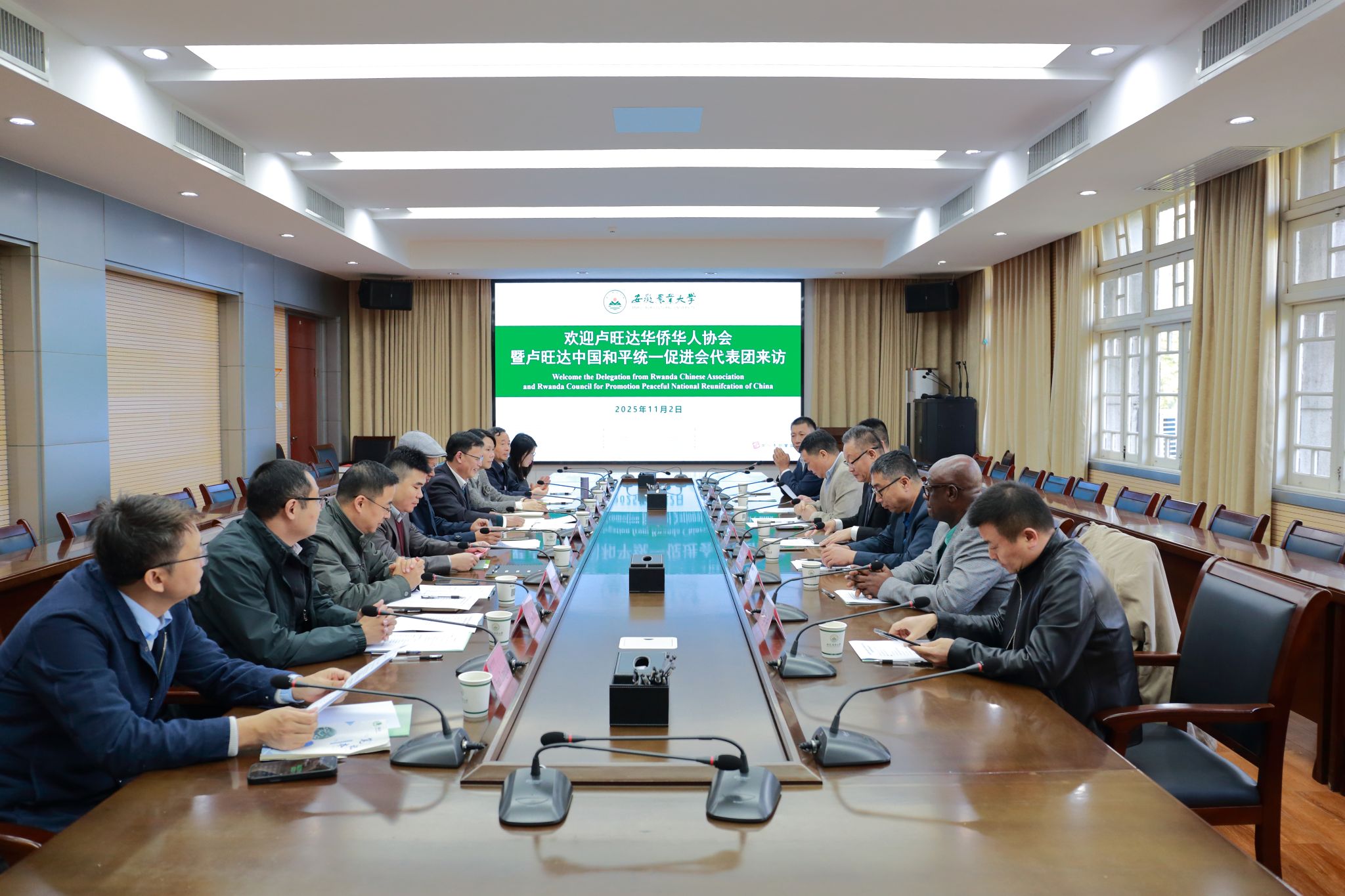 本网讯 11月2日上午,卢旺达、加纳华人华侨代表团一行来校访问。国际交流合作处处长李大祥、农学院教授董召荣热情接待了卢旺达华侨华人协会暨卢旺达中国和平统一促进会会长尹晴日、加纳中国东北商会会长晏立权、加纳大学农学院院长埃里克教授一行,安徽省归国华侨联合会海外联络部部长宋德琴陪同调研。国际交流合作处副处长马超主持座谈会。