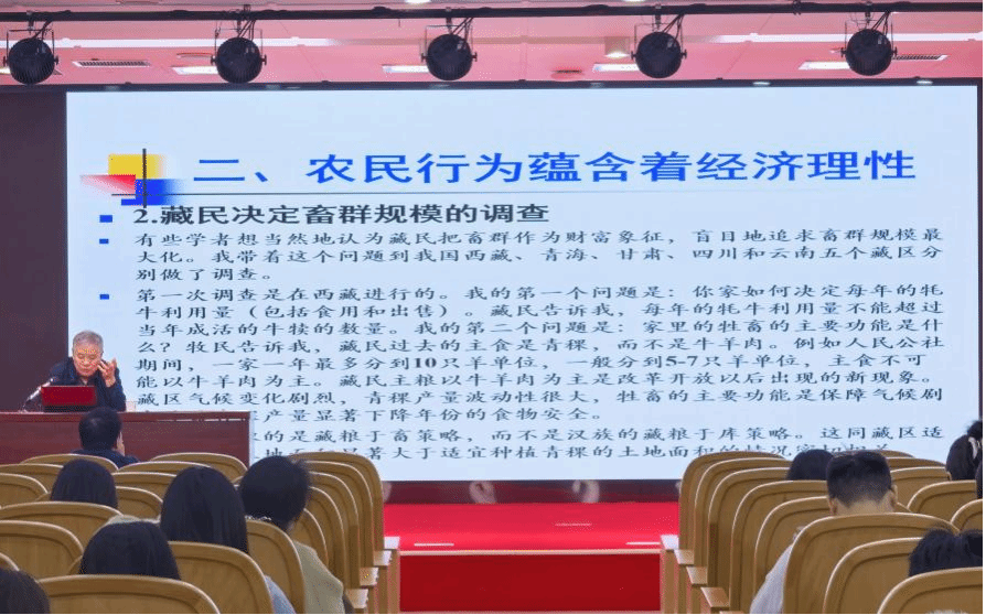 10月28日上午,“林宽讲堂”专题学术报告在九华山路校区综合楼三楼报告厅举行,报告由副院长李坦主持,院长杨波及学院100余名师生参加。报告中,李周以 “农民行为中的经济学理性 —— 田野调查中的收获”为题,结合自身长期扎根中国农村的田野调查实践,系统阐释了农民行为中的经济学逻辑。他指出,理解“三农”问题的关键在于深入分析农民在现实约束条件下的理性选择过程,必须从农民实际行为出发,把握乡村社会的运行机制。他强调,传统经济学中的理性假设应当在具体的乡村社会语境中加以修正与再解释;田野调查不仅是获取数据的手段,更是发现新问题、提出新理论的重要途径。最后,他以西藏、青海、甘肃、四川和云南等地的调研为例,揭示了农民行为中所蕴含的经济理性机制与深层逻辑。