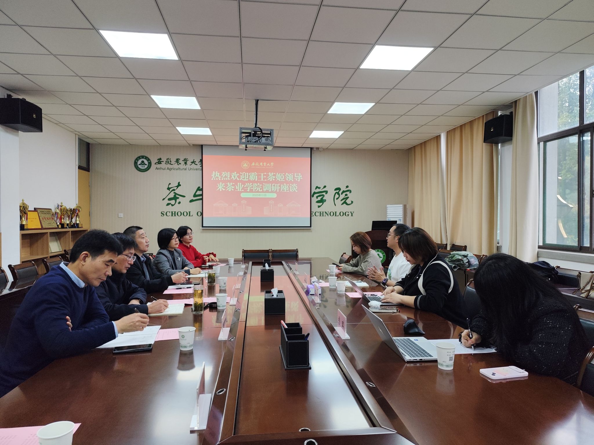 本网讯 11月7日,茶业学院与霸王茶姬校企合作调研座谈会在茶业楼221会议室顺利召开。座谈会由学院党委副书记沈周高主持,学院党委书记姜家生、副院长邓威威等领导教师,以及霸王茶姬茶产业部负责人陈鹏毅、全球招聘负责人张婧等企业代表共同参会。
