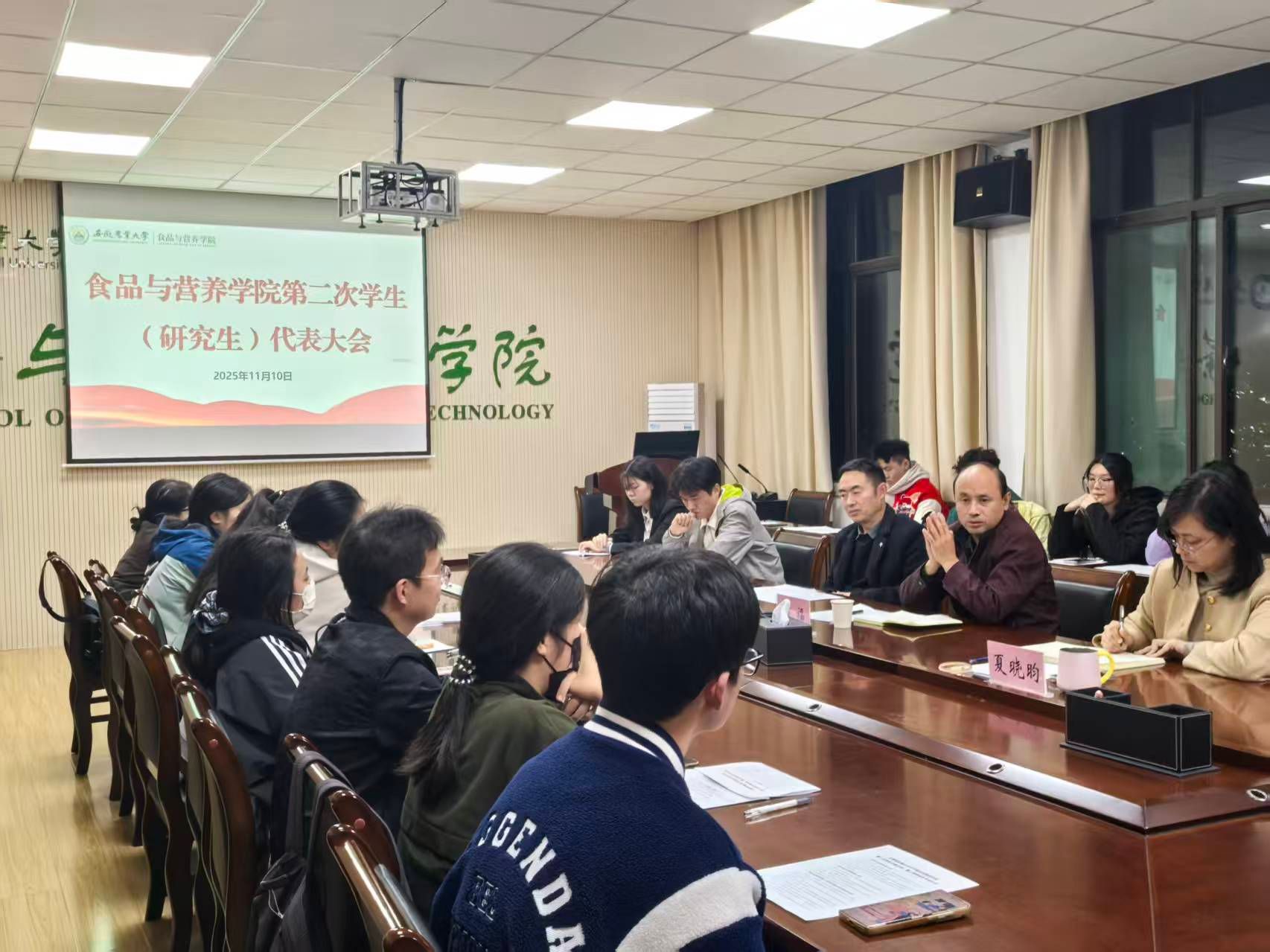 本网讯 11月10日晚,食品与营养学院第二次学生代表大会、第二次研究生代表大会在茶业楼219会议室召开,学院党委书记孙福,党委副书记、纪委书记夏晓昀,副院长梁进出席会议,学院团委老师以及全院35名本科生代表、16名研究生代表参加会议。