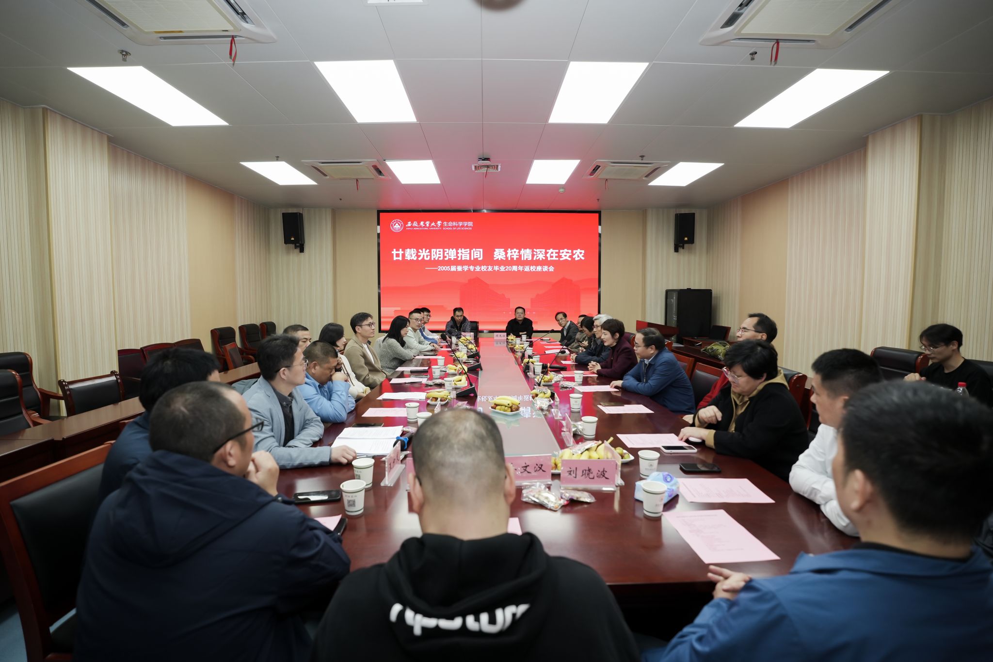 本网讯 11月8日下午,生命科学学院2005届蚕学专业校友重返母校,在生物科技楼B420会议室举行毕业20周年返校座谈会。2005届蚕学专业辅导员穆莉、孟艳,教师代表徐家萍、张和禹、王磊,学院班子成员夏利明、张应烙、何兵、顾龙江与校友代表欢聚一堂,共话往昔师生情谊,共同展望学院发展。