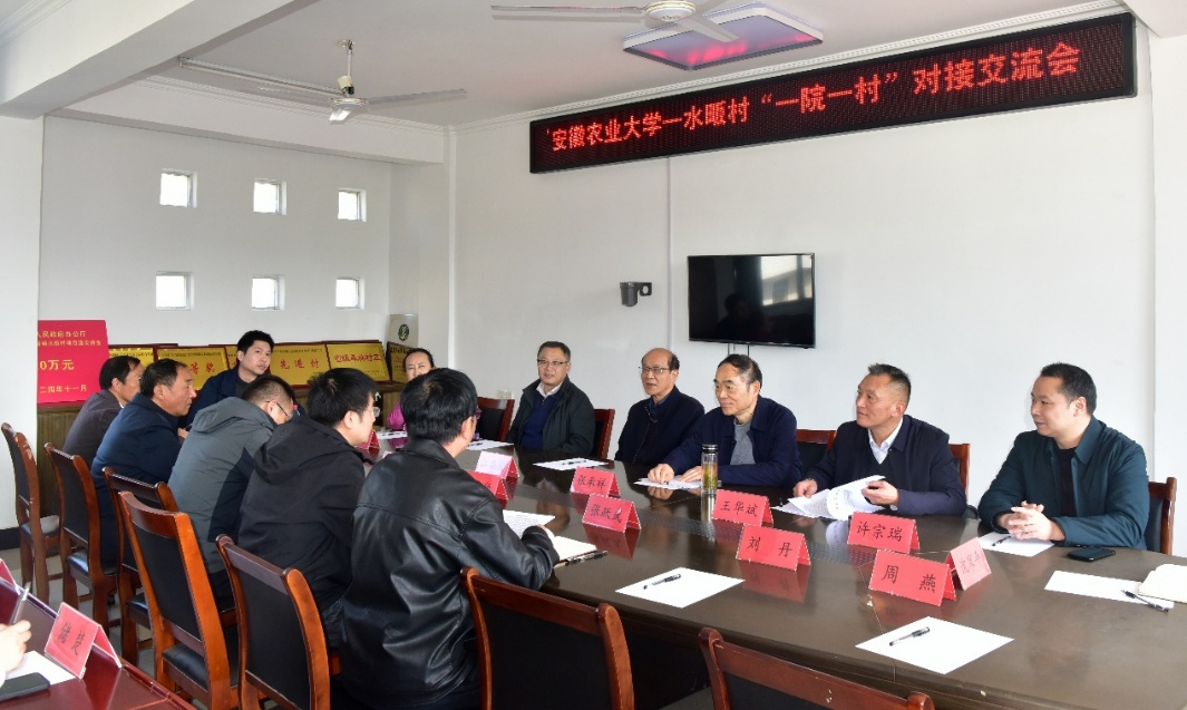 本网讯 11月11日,我校与岳西县菖蒲镇水畈村“一院一村”乡村振兴工作站在水畈村举行挂牌仪式和工作对接交流会。我校离退休工作处处长王华斌、正处级组织员史君华、外国语学院副院长许宗瑞、园艺学院副院长刘普、茶叶和乡村建设规划专家等,以及菖蒲镇副镇长蒋鹏、水畈村党总支书记张跃武、村委全体委员、部分乡村产业带头人代表参会。会议由安徽省政府办公厅驻水畈村工作队罗文伯主持。