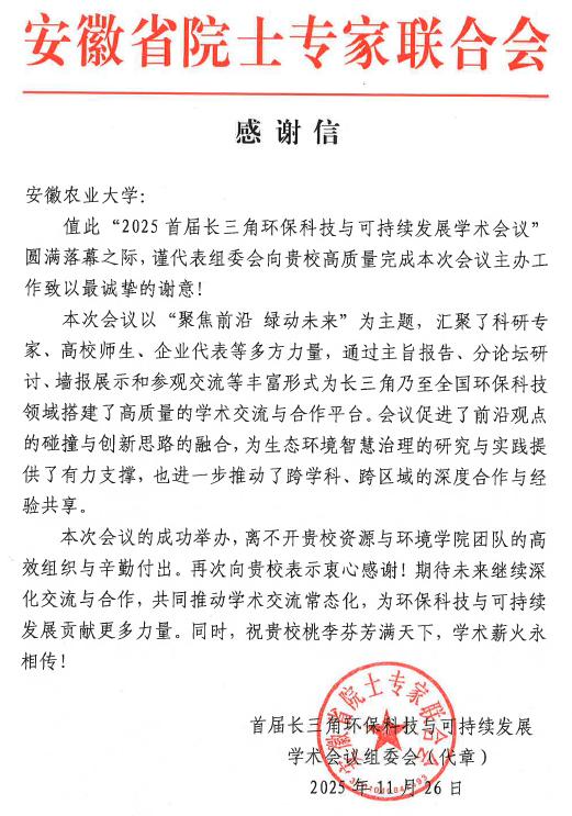 本次会议充分展示了学校在新污染物研究领域的学科特色和科研实力,为服务长三角区域生态环境高质量发展提供了重要支撑。安徽省院士专家联合会代表组委会向学校发来感谢信,高度肯定了资源与环境学院团队在会议组织中的高效工作和辛勤付出,期待未来继续深化交流合作,推动学术交流常态化,为环保科技与可持续发展贡献更多力量。(文图:谢正鑫 初审:唐俊 复审:刘加华 审核:曹雷)