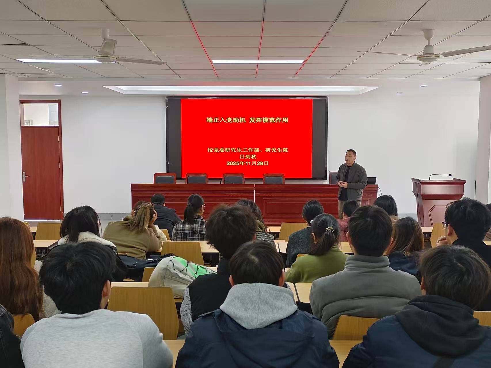 会上,吕剑秋以“端正入党动机 发挥模范作用”为题,通过讲述马克思耗尽心血探索真理、发现社会价值规律的事迹,阐释“社会主义取代资本主义、必将走向共产主义”的历史必然;以李大钊等先驱投身革命的壮举,诠释共产党人的初心使命。他鼓励同学们在入党过程中不断锤炼思想、实现自我升华。他用“平常时刻看得出、关键时刻站得出、危机时刻豁得出”精准概括先锋模范作用的内涵,随后带领全体同学重温入党誓词,以铿锵誓言筑牢信仰之基。