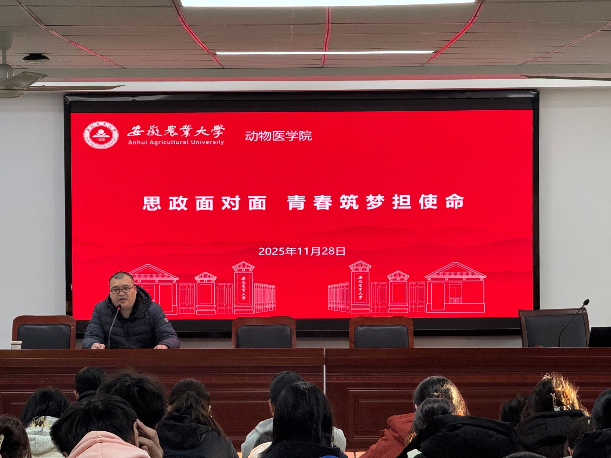 本网讯 11月28日,动物医学院在318教室举办入党积极分子培训与“思政面对面 青春筑梦担使命”主题分享会。党委研究生工作部副部长、研究生院副院长吕剑秋,研究生院副院长姚辰松做报告,活动由动物医学院党委副书记张锐主持,此次活动聚焦入党教育与考研规划,为学子成长精准赋能。