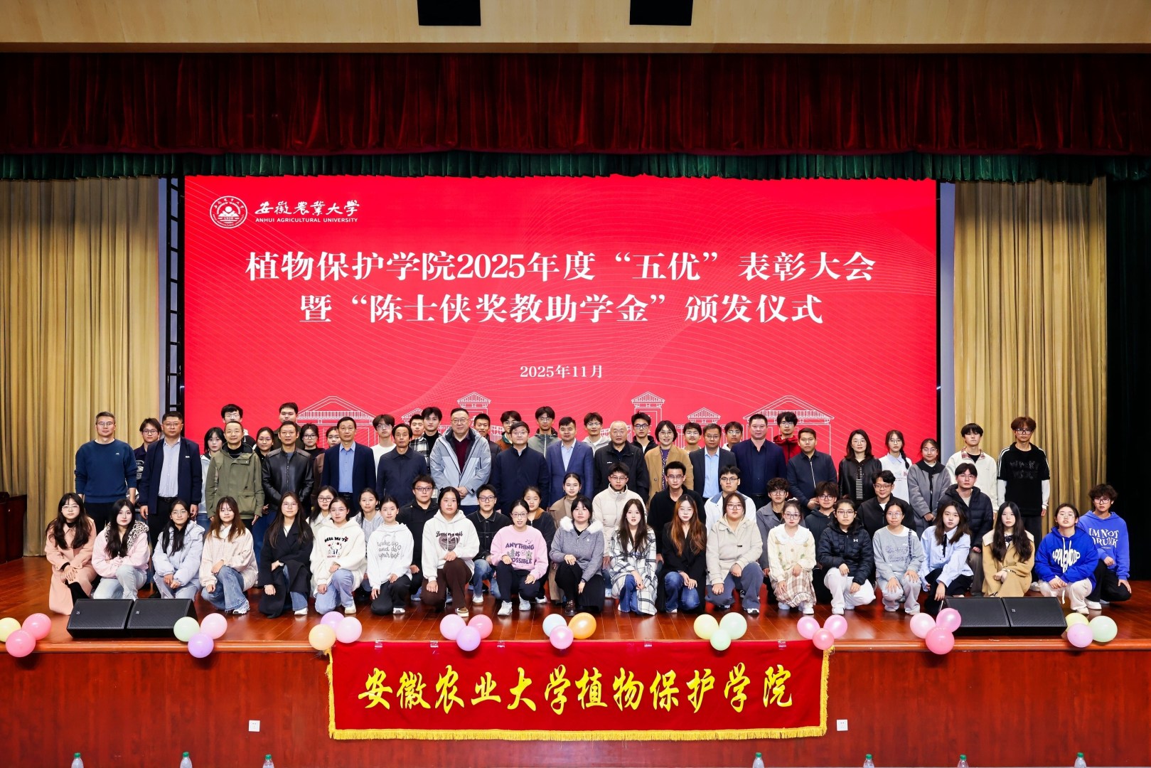 本网讯 11月30日下午,植物保护学院在校图书馆第一报告厅举办2025年度“五优”表彰大会暨“陈士侠奖教助学金”颁发仪式。校党委组织部、教务处、学生处、团委、体育部等单位负责人以及全国模范教师、长三角劳模、原国家产业岗位科学家等学院优秀教师代表、学院2005届优秀校友、杭州欢田喜地公司创始人李涛等出席活动并为获奖同学颁奖。学院党政领导班子、系主任、专业教师代表、本科生辅导员、2025级全体本科新生、部分高年级学生代表以及获奖同学400余人参加了活动。