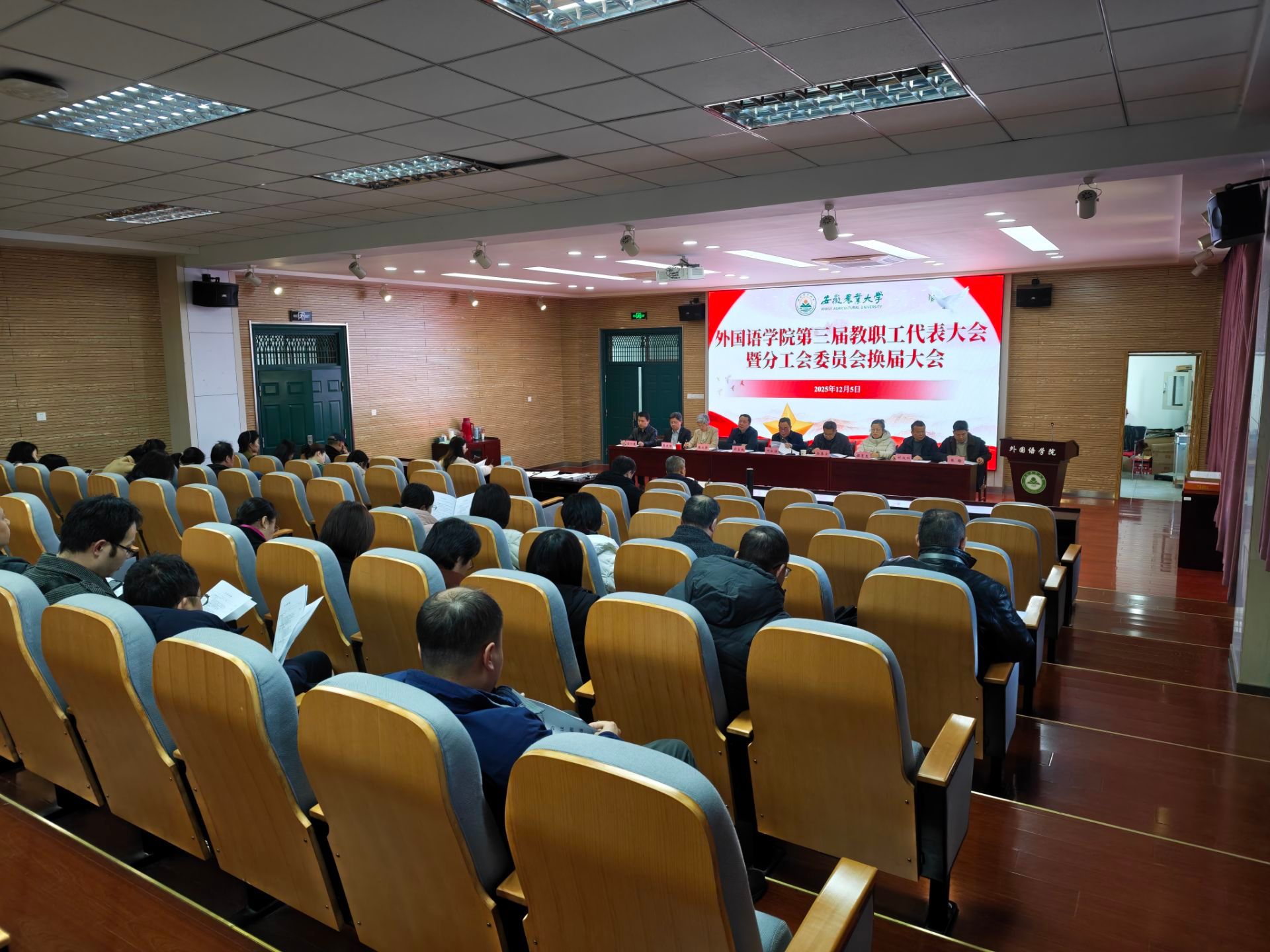 本网讯 12月5日下午,外国语学院第三届教职工代表大会暨分工会委员会换届大会在庄严的国歌声中隆重开幕。校工会副主席徐春安参会指导,学院党政领导、正式代表、列席代表及特邀代表参加大会。会议由学院党委书记何如海主持。