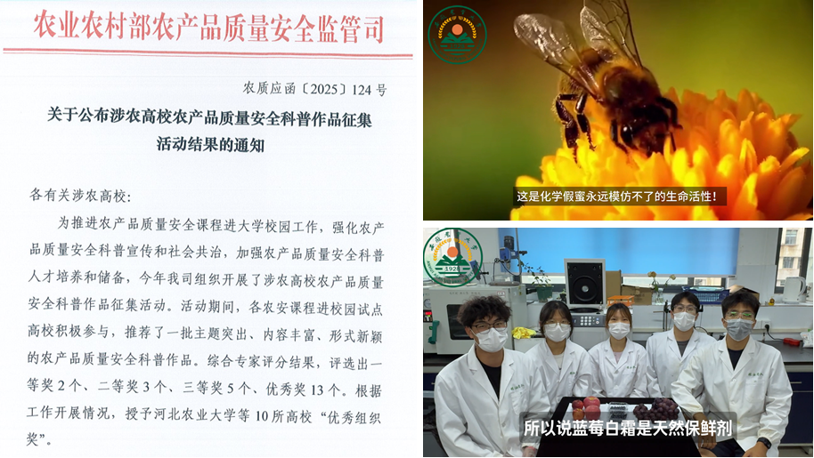 本网讯 12月4日,农业农村部农产品质量安全监管司公布了2025年涉农高校农产品质量安全科普作品征集活动评选结果。食品与营养学院刘英男、肖亚庆两位老师指导的作品《“辨蜜达人”超实用蜂蜜品质鉴别小妙招》和《蓝莓白霜与苹果打蜡科普小课堂》,凭借突出的创意与扎实的科普效果,分获三等奖和优秀奖。
