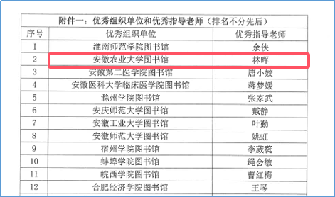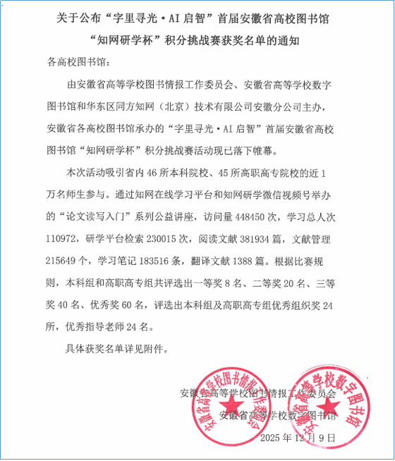 本网讯 近日,由安徽省高等学校图书情报工作委员会、安徽省高等学校数字图书馆与华东区同方知网(北京)技术有限公司安徽分公司联合主办,全省各高校图书馆承办的“字里寻光·AI启智”首届安徽省高校图书馆“知网研学杯”积分挑战赛圆满落幕。学校学子凭借扎实的专业能力和实践积累脱颖而出,共斩获一等奖1项,三等奖6项,优秀奖7项,图书馆荣获优秀组织单位,林晖老师被评为优秀指导老师。