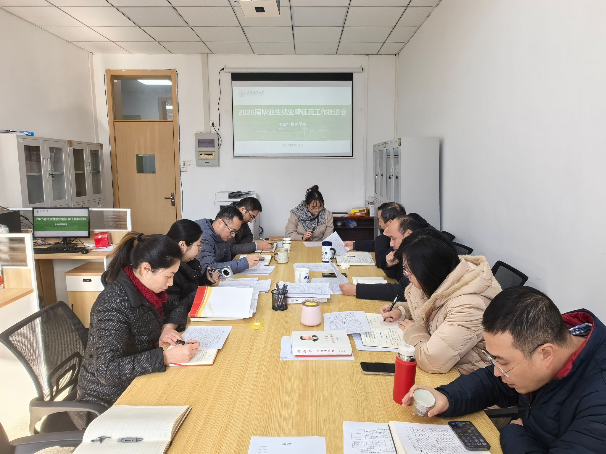 本网讯 12月26日上午,食品与营养学院在茶业楼415会议室召开2026届毕业生就业暨征兵工作推进会。学院就业工作领导小组全体成员参会,会议由院党委书记孙福主持。