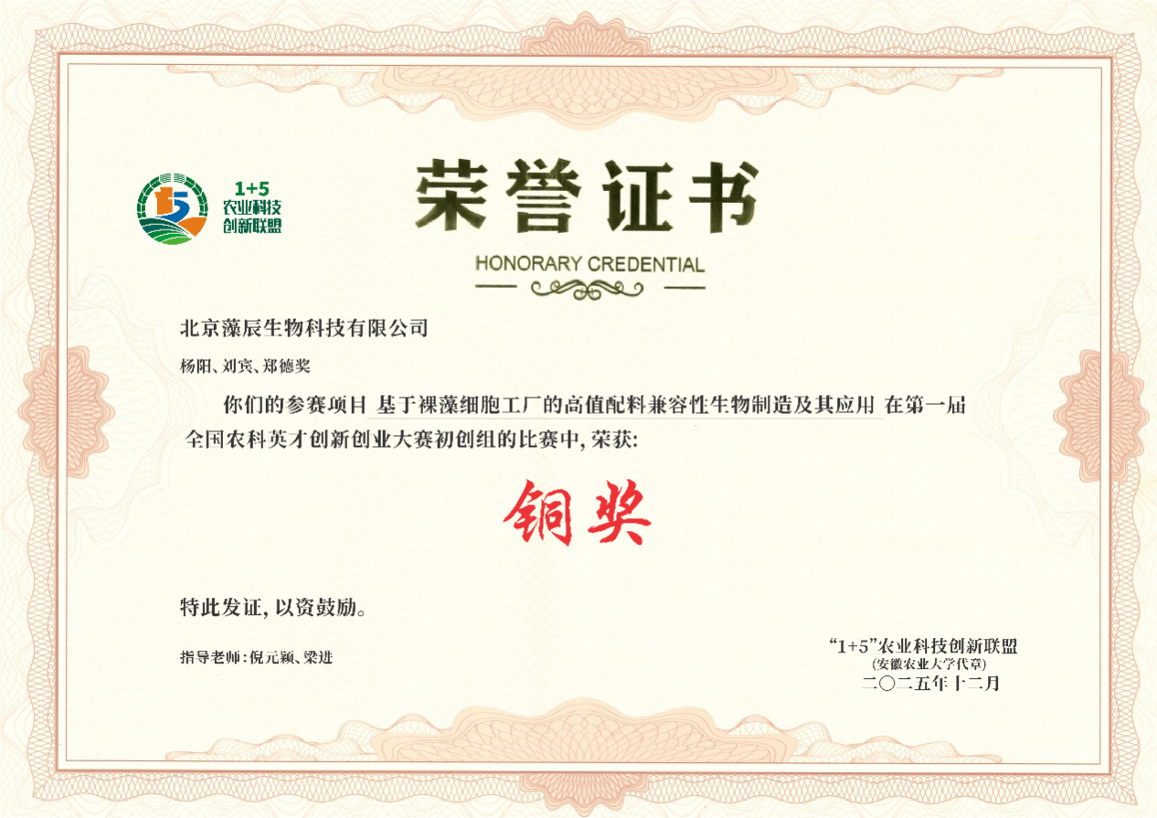 本网讯 近日,在第一届全国农科英才创新创业大赛总决赛中,由食品与营养学院梁进教授与中国农业大学倪元颖教授共同指导,北京藻辰生物科技有限公司申报的《基于裸藻细胞工厂的高值配料兼容性生物制造及其应用》项目,从全国近700个参赛项目中脱颖而出,荣获大赛铜奖。该项目聚焦“生物制造”领域,成功构建了可灵活生产多种高附加值功能性配料的裸藻平台技术,为健康食品、保健品、化妆品等领域提供了绿色、可持续的原料解决方案。