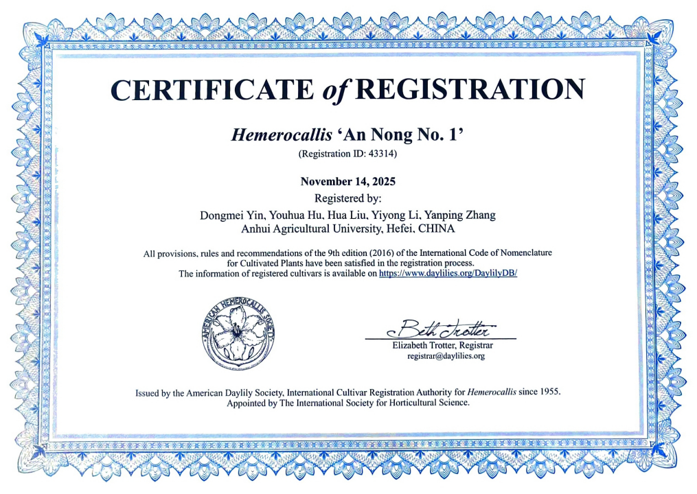 美国萱草协会是由国际园艺学会指定的最为权威、最具影响力的萱草属新品种法定登录机构。本次我校萱草新品种成功获得国际登录,既是国际同行对我校育种成果的认可,对于强化国内国际专业合作与学术交流具有重要意义。