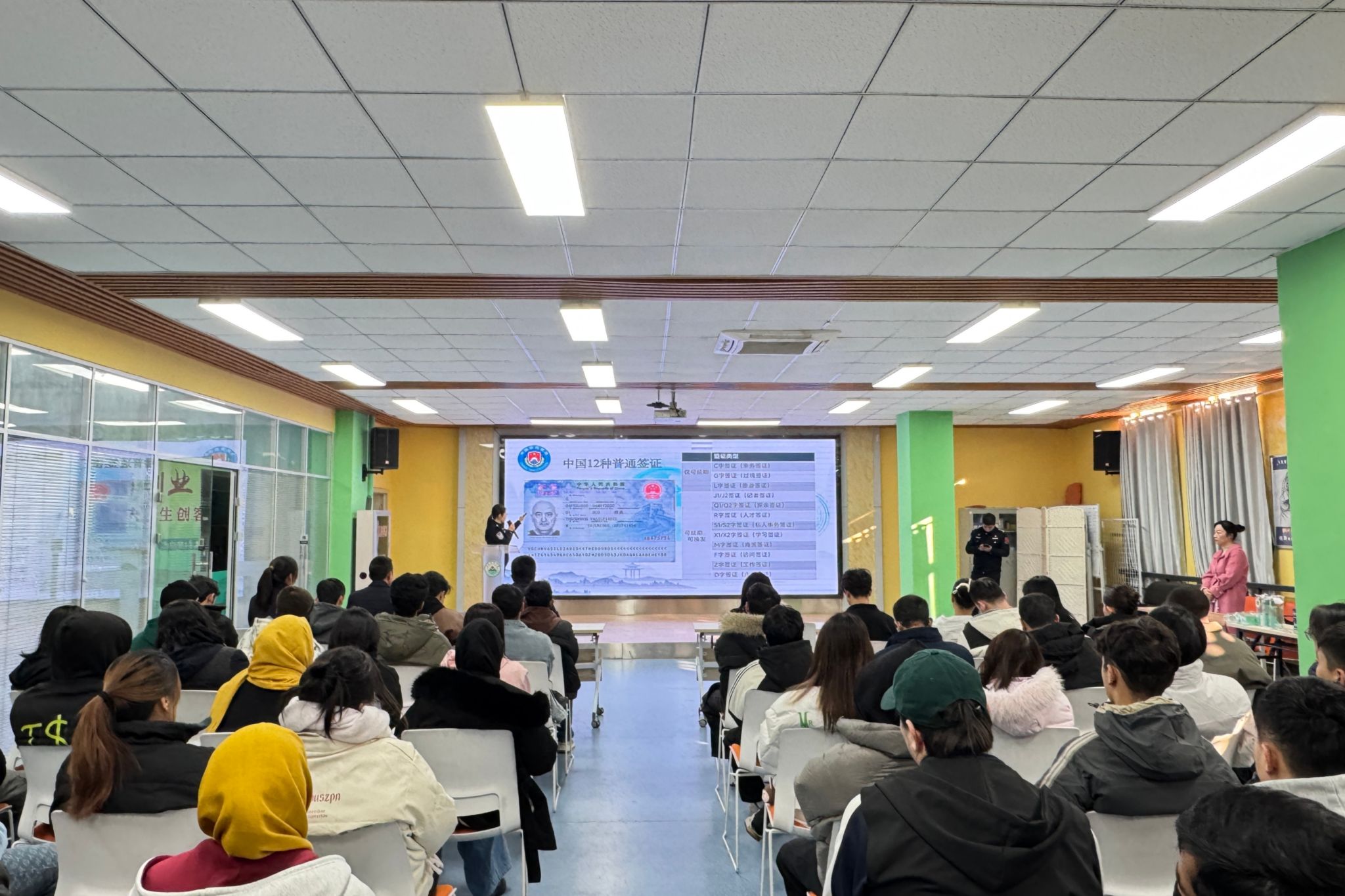 课堂上,边检民警结合《中华人民共和国出境入境管理法》及最新修订的《外国人入境出境管理条例》相关规定,聚焦留学生群体最关心的出入境流程、签证与居留许可管理等方面开展讲解,同时为增强普法效果,活动还设置了互动答题环节。