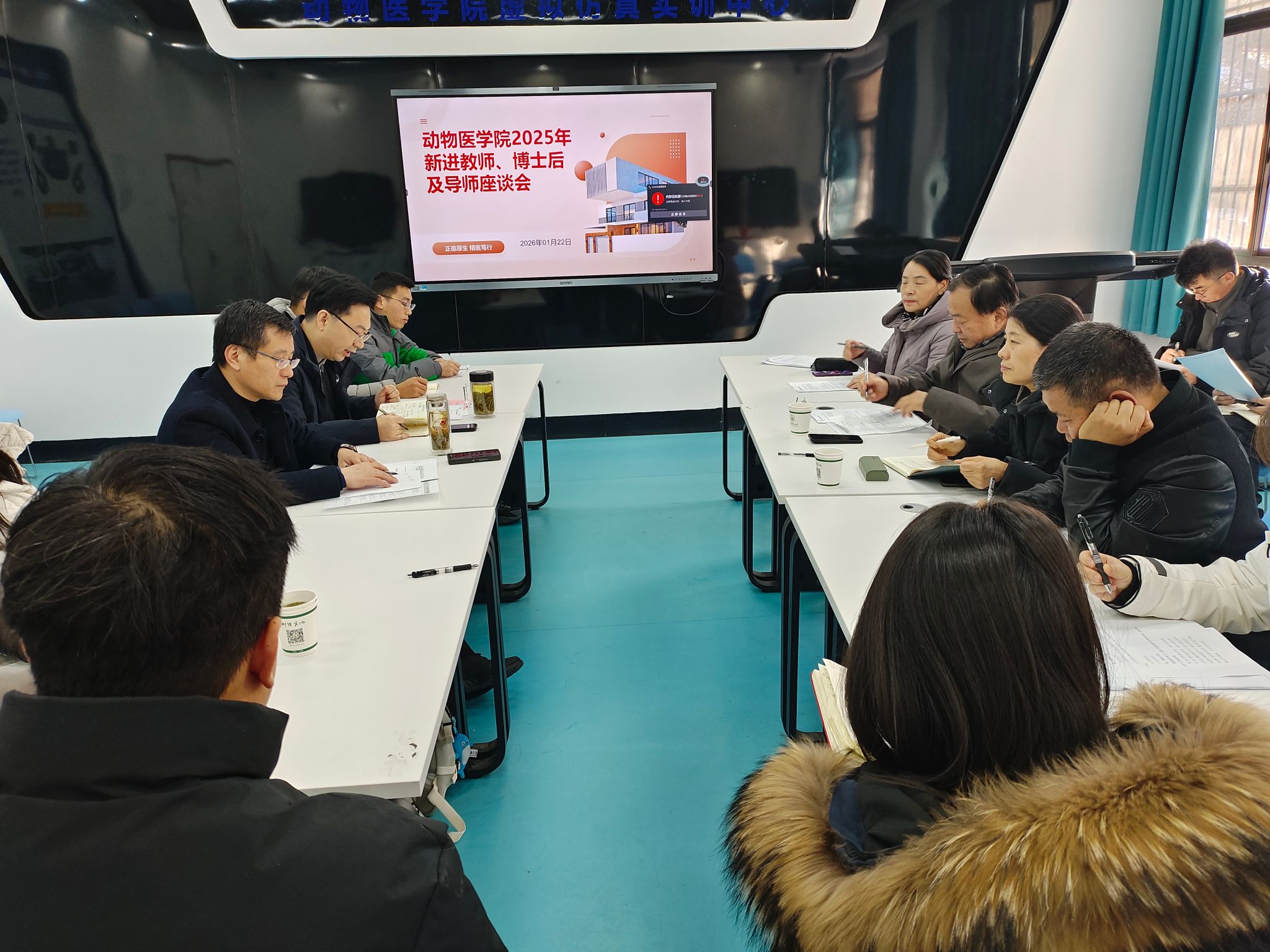 本网讯 1月22日,动物医学院组织召开新进教师、博士后及导师座谈会。学院领导班子、青年教师导师、新进教师、博士后及合作导师参会。会议由院长孙裴主持。