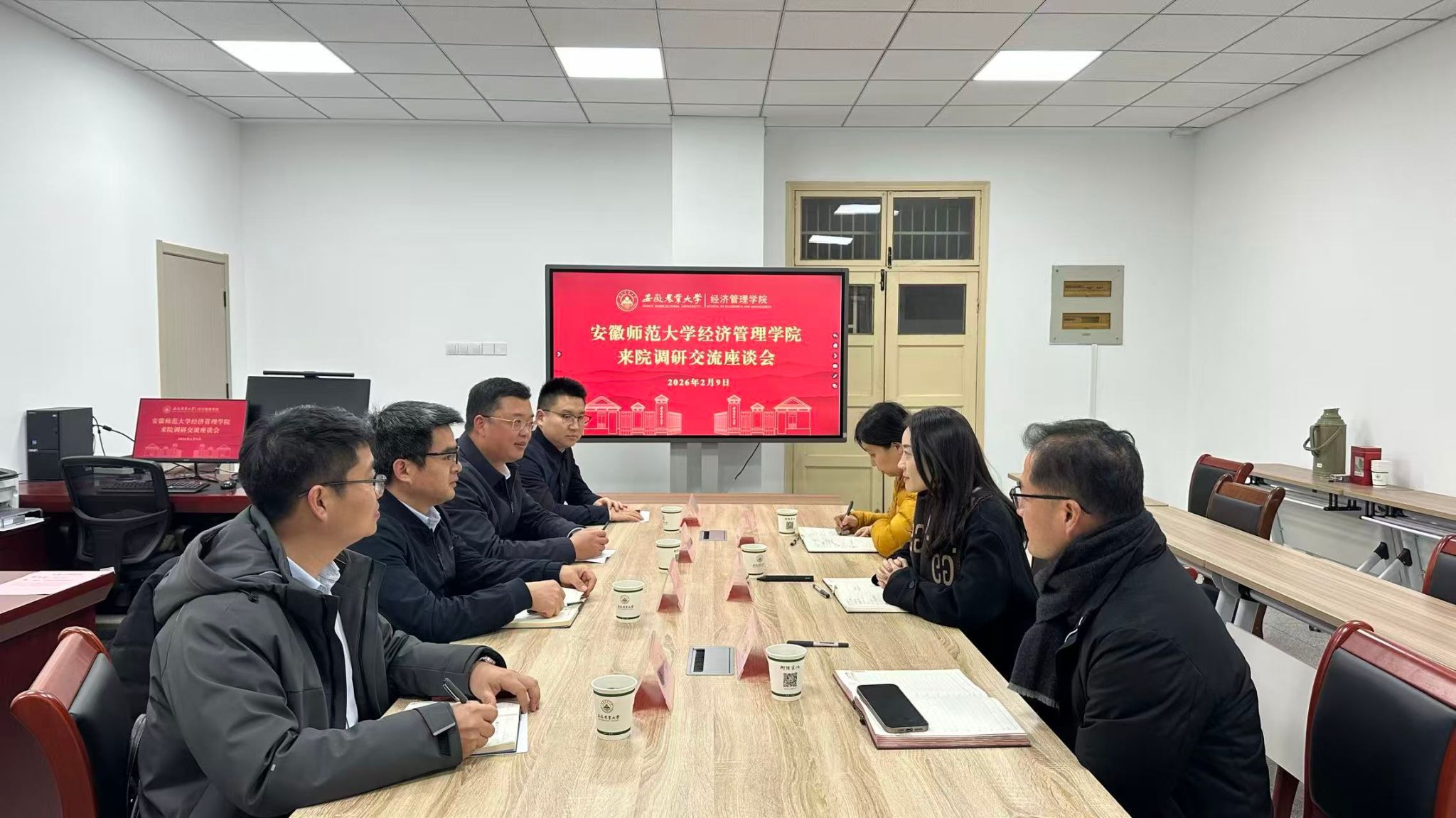 本网讯 2月9日,安徽师范大学经济管理学院院长马长伟、副书记(主持党委工作)孙良林、副院长徐飞、副院长孔敏来经济管理学院调研交流。学院党委书记武晓蓓、党委副书记、纪委书记周涛、副院长李坦参加座谈会,会议由武晓蓓主持。