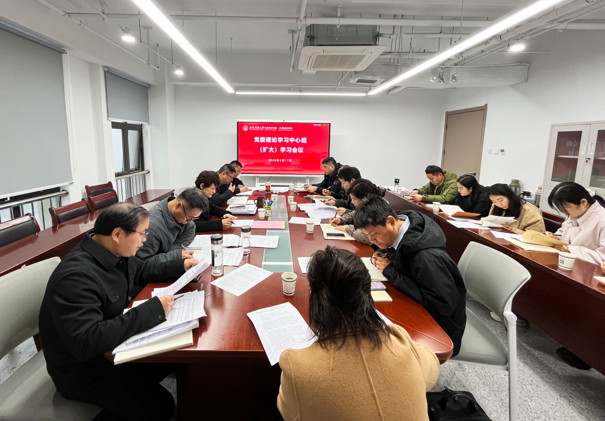 本网讯 3月17日上午,生命科学学院(生物制造学院)在勤业楼1808会议室召开党委理论学习中心组(扩大)学习会。院党委理论学习中心组成员、系部及实验中心主任,党支部书记参加学习,会议由学院党委副书记(主持工作)夏利明主持。