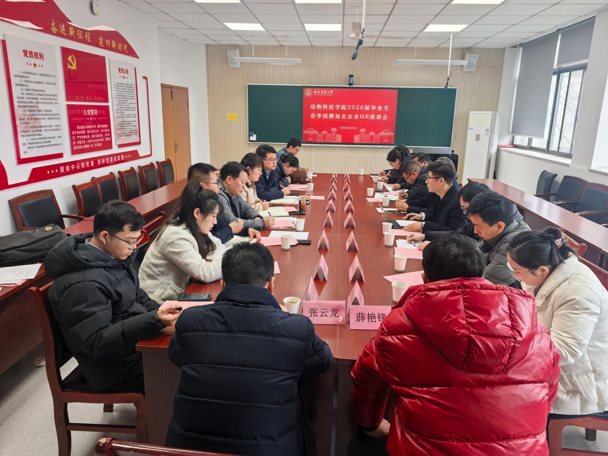 本网讯 3月18日上午,动物科技学院举办2026届毕业生春季招聘知名企业HR座谈会。牧原集团、正大集团、双胞胎集团、海大集团、通威集团、伊利集团、新希望六和、唐人神、天康畜牧、天邦汉世伟、福建傲农集团、安徽扬翔股份等12家农牧企业人事负责人受邀参会。校党委学工部副部长、学生处副处长汪小强,动物科技学院副院长(主持工作)凌英会、副书记卢伟及各系部主任出席座谈会。会议由学院党委书记沈兆梅主持。