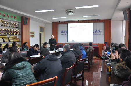 本网讯 为进一步规范试卷管理,提高试卷命题质量和规范试卷评价体系,1月4日下午,资源与环境学院邀请学校2015年教学突出贡献奖获得者、校教学名师巫厚长教授为全院教师做《试卷质量评价要素分析》的专题辅导报告和相关课程闭卷考核的知识培训。院长郜红建教授主持培训报告会。