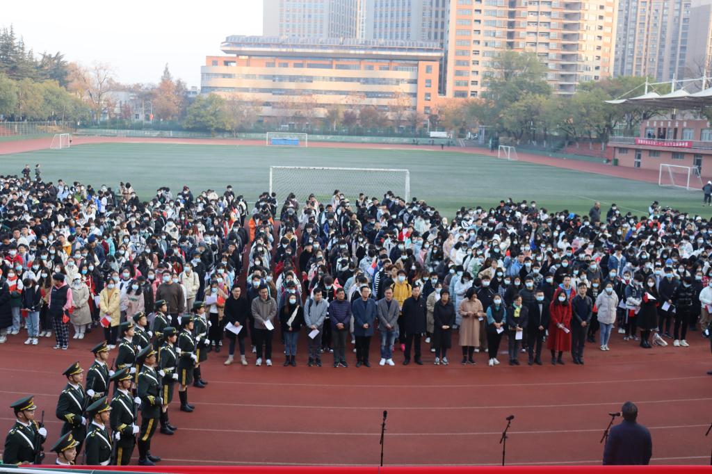 上午7时,国旗护卫队昂首挺胸护卫国旗,迎着朝阳,迈着整齐的步伐行进至升旗台。伴随着雄壮的《义勇军进行曲》,鲜艳的五星红旗冉冉升起,全场肃立行注目礼,齐声高唱中华人民共和国国歌,嘹亮的歌声响彻校园。